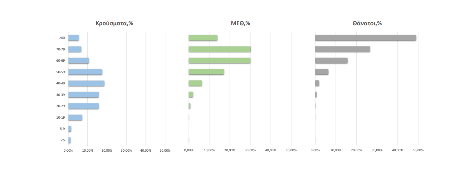 Ακολούθως παρουσιάζεται η ηλικιακή κατανομή των (α) συνολικών κρουσμάτων, (β) των περιστατικών που κατέληξαν σε θάνατο και (γ) των ασθενών που νοσηλεύονται διασωληνωμένοι: