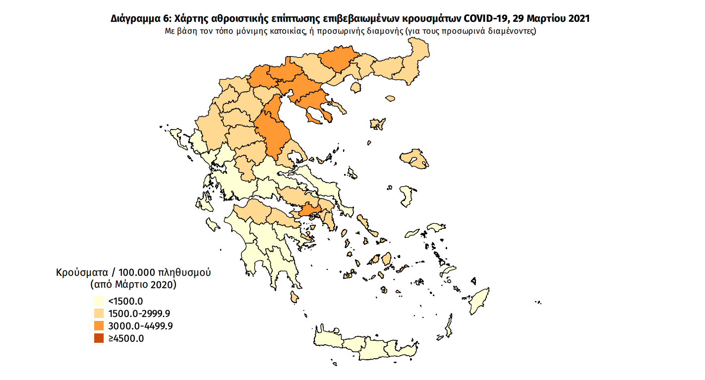 Γεωγραφική διασπορά: Ο χάρτης αποτυπώνει τη γεωγραφική κατανομή των συνολικών κρουσμάτων COVID-19 (από την αρχή της επιδημίας) ανά Περιφερειακή Ενότητα της χώρας, με βάση την δηλωθείσα διεύθυνση μόνιμης κατοικίας του ασθενούς, ή τη διεύθυνση προσωρινής διαμονής για τους τουρίστες και άλλους προσωρινά διαμένοντες στην Ελλάδα. Συμπεριλαμβάνονται τόσο κρούσματα με ιστορικό ταξιδίου (“εισαγόμενα”) όσο και κρούσματα με πιθανή εγχώρια μετάδοση.