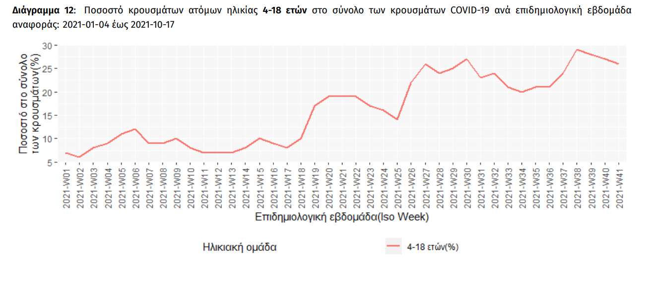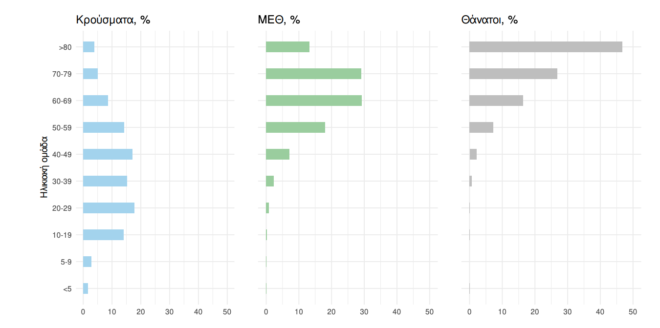 Ο αριθμός των ασθενών που νοσηλεύονται διασωληνωμένοι είναι 351 (65.0% άνδρες). Η διάμεση ηλικία τους είναι 66 έτη. To 81.5% έχει υποκείμενο νόσημα ή/και ηλικία 70 ετών και άνω. Μεταξύ των ασθενών που νοσηλεύονται διασωληνωμένοι, 311 (88.6%) είναι ανεμβολίαστοι ή μερικώς εμβολιασμένοι και 40 (11.4%) είναι πλήρως εμβολιασμένοι. Από την αρχή της πανδημίας έχουν εξέλθει από τις ΜΕΘ 3.259 ασθενείς. Οι εισαγωγές2 νέων ασθενών Covid-19 στα νοσοκομεία της επικράτειας είναι 213 (ημερήσια μεταβολή +10.94%). Ο μέσος όρος εισαγωγών του επταημέρου είναι 207 ασθενείς.Η διάμεση ηλικία των κρουσμάτων είναι 39 έτη (εύρος 0.2 έως 106 έτη), ενώ η διάμεση ηλικία των θανόντων είναι 78 έτη (εύρος 0.2 έως 106 έτη). Διάγραμμα 4: Ηλικιακή Κατανομή κρουσμάτων, νοσηλευόμενων στις MEΘ και ασθενών που απεβίωσαν από την αρχή της πανδημίας
