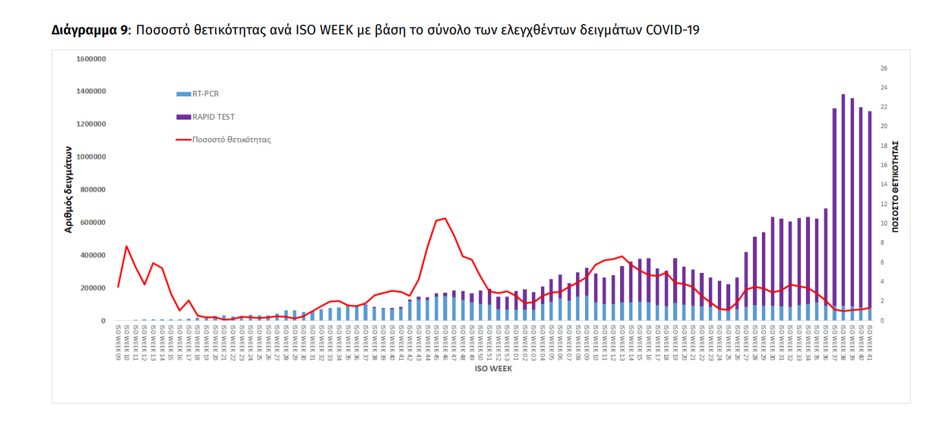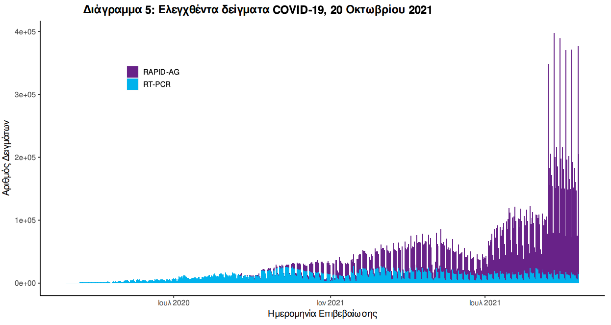 Δείγματα που έχουν ελεγχθεί: Από την 1η Ιανουαρίου 2020 μέχρι σήμερα, στα εργαστήρια που διενεργούν ελέγχους για τον νέο κορωνοϊό (SARS-CoV-2) και που δηλώνουν συστηματικά το σύνολο των δειγμάτων που ελέγχουν, έχουν συνολικά ελεγχθεί 6.867.670 κλινικά δείγματα ενώ από Μονάδες Υγείας και Κλιμάκια του ΕΟΔΥ που διενεργούν ελέγχους Rapid Ag έχουν ελεγχθεί 17.058.243 δείγματα. O μέσος όρος του επταημέρου είναι 185.622 δειγματοληπτικοί έλεγχοι. Αυτοδιαγνωστικοί έλεγχοι (Self-tests): Έως 19 Οκτωβρίου 2021, έχουν καταγραφεί ηλεκτρονικά 44.568.389 δηλώσεις αποτελέσματος αυτοδιαγνωστικού ελέγχου. Από τα 2.545.061 άτομα που προσήλθαν για επανέλεγχο, έχουν καταγραφεί 124.277 θετικά αποτελέσματα. Mαζικές Δειγματοληψίες ΕΟΔΥ: Στις 19 Οκτωβρίου 2021, πραγματοποιήθηκαν 169 δράσεις δειγματοληπτικών ελέγχων από τις Κινητές Ομάδες Υγείας (ΚΟΜΥ) του ΕΟΔΥ, στις οποίες διενεργήθηκαν 16.382 έλεγχοι Rapid Ag και ανευρέθηκαν 496 θετικά (3.03%)
