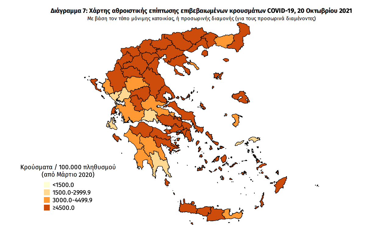 Τα στοιχεία που παρουσιάζονται αφορούν περιστατικά από την επιδημιολογική επιτήρηση της νόσου από το νέο κορωνοϊό (COVID19), με βάση τα δεδομένα που έχουν δηλωθεί στον ΕΟΔΥ και καταγραφεί μέχρι τις 20 Οκτωβρίου 2021 (ώρα 15:00). Τα νέα εργαστηριακά επιβεβαιωμένα κρούσματα της νόσου που καταγράφηκαν τις τελευταίες 24 ώρες είναι 3.279, εκ των οποίων 6 εντοπίστηκαν κατόπιν ελέγχων στις πύλες εισόδου της χώρας.