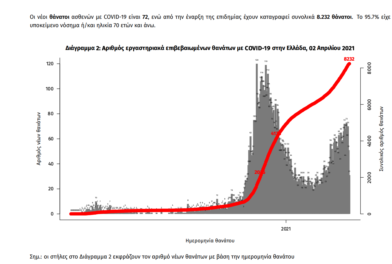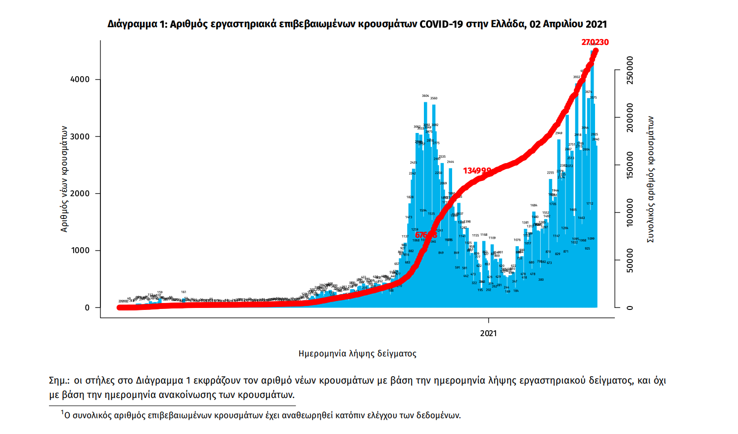 Τα στοιχεία που παρουσιάζονται αφορούν περιστατικά από την επιδημιολογική επιτήρηση της νόσου από το νέο κορωνοϊό (COVID19), με βάση τα δεδομένα που έχουν δηλωθεί στον ΕΟΔΥ και καταγραφεί μέχρι τις 02 Απριλίου 2021 (ώρα 15:00). Τα νέα εργαστηριακά επιβεβαιωμένα κρούσματα της νόσου που καταγράφηκαν τις τελευταίες 24 ώρες είναι 3.080, εκ των οποίων 14 εντοπίστηκαν κατόπιν ελέγχων στις πύλες εισόδου της χώρας. Ο συνολικός αριθμός των κρουσμάτων ανέρχεται σε 270.230 (ημερήσια μεταβολή +1.2%), εκ των οποίων 51.5% άνδρες. 1 Με βάση τα επιβεβαιωμένα κρούσματα των τελευταίων 7 ημερών, 101 θεωρούνται σχετιζόμενα με ταξίδι από το εξωτερικό και 3.003 είναι σχετιζόμενα με ήδη γνωστό κρούσμα. Ημερήσια εξέλιξη της πανδημίας: Η ημερήσια κατανομή των επιβεβαιωμένων κρουσμάτων είναι η ακόλουθη (η γραμμή παριστάνει την συνολική, αθροιστική κατανομή των κρουσμάτων).