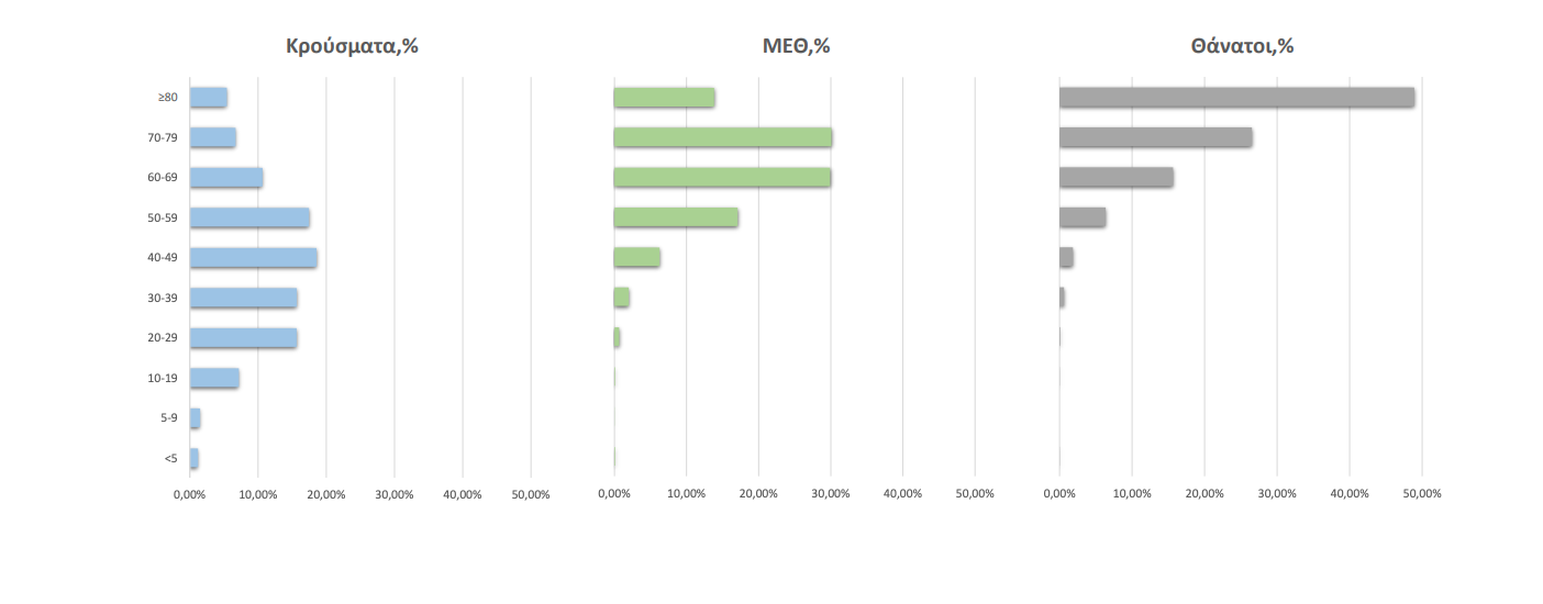 Ακολούθως παρουσιάζεται η ηλικιακή κατανομή των (α) συνολικών κρουσμάτων, (β) των περιστατικών που κατέληξαν σε θάνατο και (γ) των ασθενών που νοσηλεύονται διασωληνωμένοι: