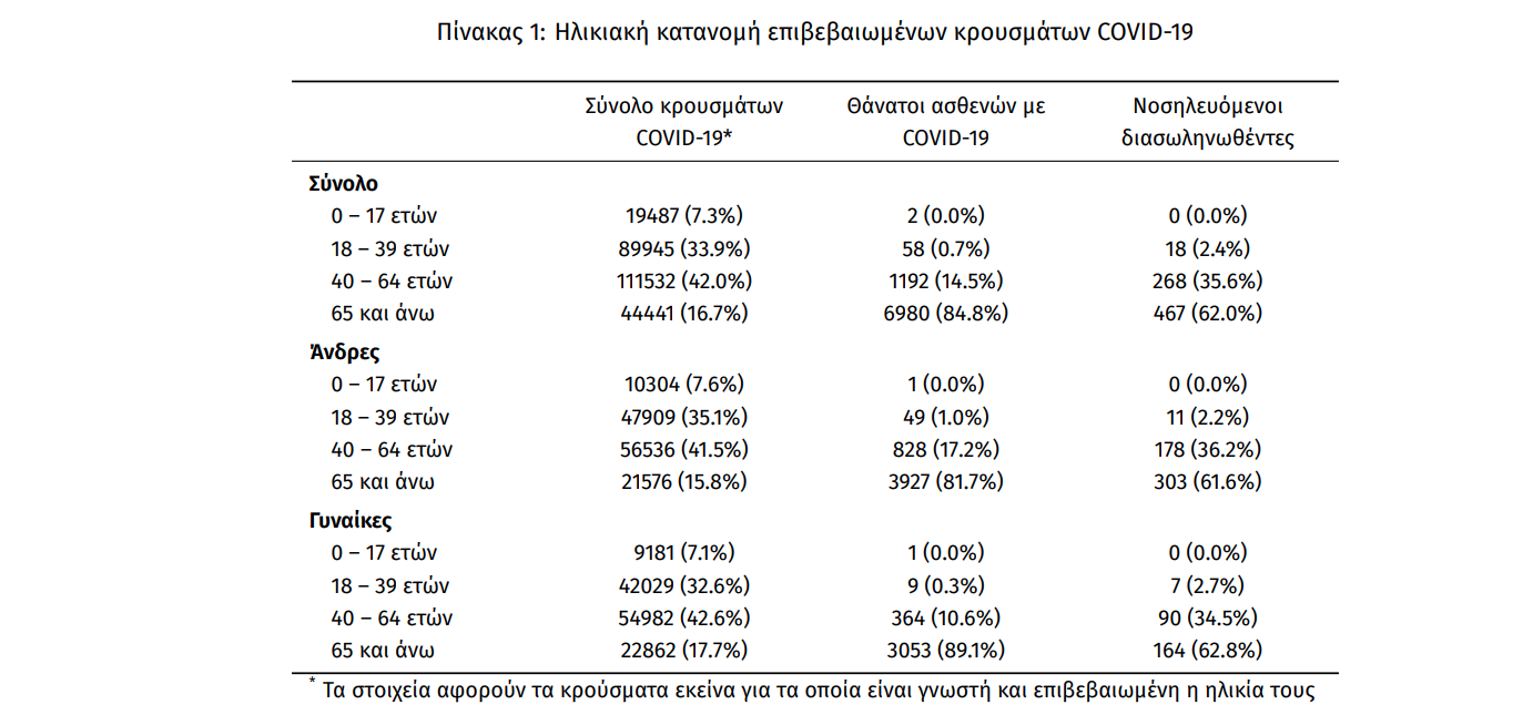 Ο αριθμός των ασθενών που νοσηλεύονται διασωληνωμένοι είναι 753 (65.1% άνδρες). Η διάμεση ηλικία τους είναι 68 έτη. To 83.0% έχει υποκείμενο νόσημα ή/και ηλικία 70 ετών και άνω. Από την αρχή της πανδημίας έχουν εξέλθει από τις ΜΕΘ 1.733 ασθενείς. Οι εισαγωγές2 νέων ασθενών Covid-19 στα νοσοκομεία της επικράτειας είναι 562 (ημερήσια μεταβολή +0.18%). Ο μέσος όρος εισαγωγών του επταημέρου είναι 465 ασθενείς.Η διάμεση ηλικία των κρουσμάτων είναι 44 έτη (εύρος 0.2 έως 105 έτη), ενώ η διάμεση ηλικία των θανόντων είναι 79 έτη (εύρος 0 έως 103 έτη). Διάγραμμα 4: Ηλικιακή Κατανομή κρουσμάτων, νοσηλευόμενων στις MEΘ και ασθενών που απεβίωσαν από την αρχή της πανδημίας