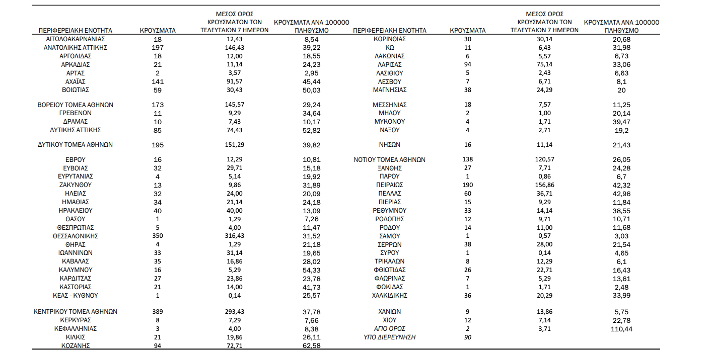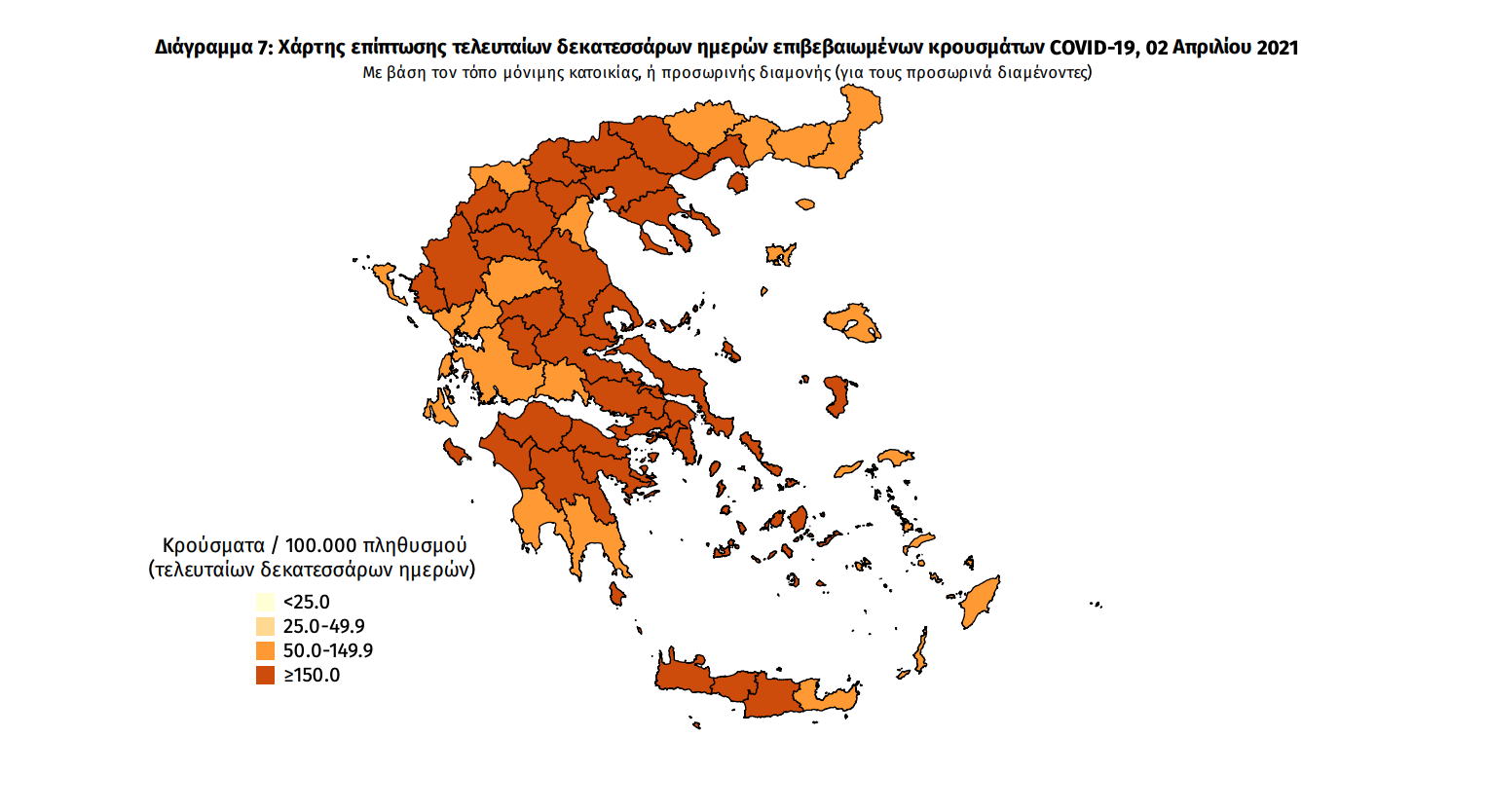 Γεωγραφική διασπορά: Ο χάρτης αποτυπώνει τη γεωγραφική κατανομή των συνολικών κρουσμάτων COVID-19 (από την αρχή της επιδημίας) ανά Περιφερειακή Ενότητα της χώρας, με βάση την δηλωθείσα διεύθυνση μόνιμης κατοικίας του ασθενούς, ή τη διεύθυνση προσωρινής διαμονής για τους τουρίστες και άλλους προσωρινά διαμένοντες στην Ελλάδα. Συμπεριλαμβάνονται τόσο κρούσματα με ιστορικό ταξιδίου (“εισαγόμενα”) όσο και κρούσματα με πιθανή εγχώρια μετάδοση.