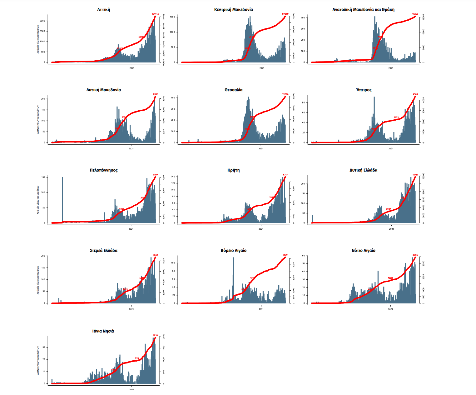 Παράρτημα 1: Επιδημικές καμπύλες κρουσμάτων COVID-19 με βάση την δηλωθείσα διεύθυνση μόνιμης κατοικίας του κρούσματος ή τη διεύθυνση προσωρινής διαμονής για τους τουρίστες και άλλους προσωρινά διαμένοντες στην Ελλάδα. Συμπεριλαμβάνονται τόσο κρούσματα με ιστορικό ταξιδίου όσο και κρούσματα με πιθανή εγχώρια μετάδοση.