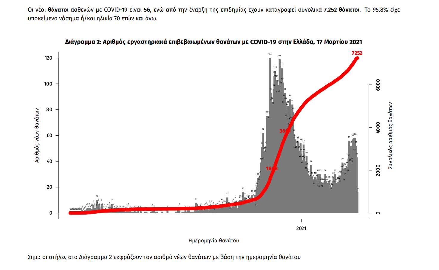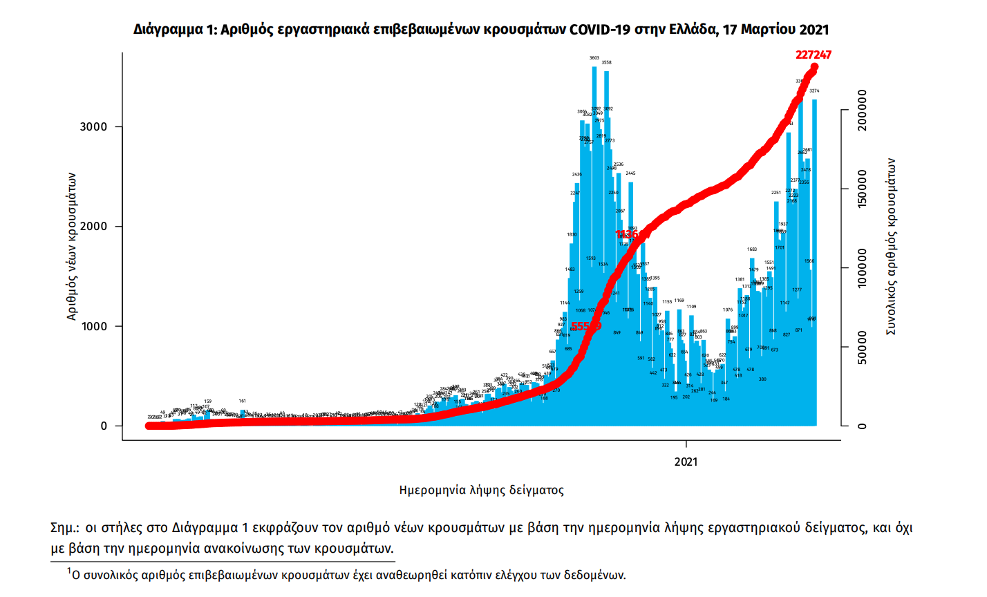 Τα στοιχεία που παρουσιάζονται αφορούν περιστατικά από την επιδημιολογική επιτήρηση της νόσου από το νέο κορωνοϊό (COVID19), με βάση τα δεδομένα που έχουν δηλωθεί στον ΕΟΔΥ και καταγραφεί μέχρι τις 17 Μαρτίου 2021 (ώρα 15:00). Τα νέα εργαστηριακά επιβεβαιωμένα κρούσματα της νόσου που καταγράφηκαν τις τελευταίες 24 ώρες είναι 3.465, εκ των οποίων 12 εντοπίστηκαν κατόπιν ελέγχων στις πύλες εισόδου της χώρας. Ο συνολικός αριθμός των κρουσμάτων ανέρχεται σε 227.247 (ημερήσια μεταβολή +1.5%), εκ των οποίων 51.6% άνδρες.