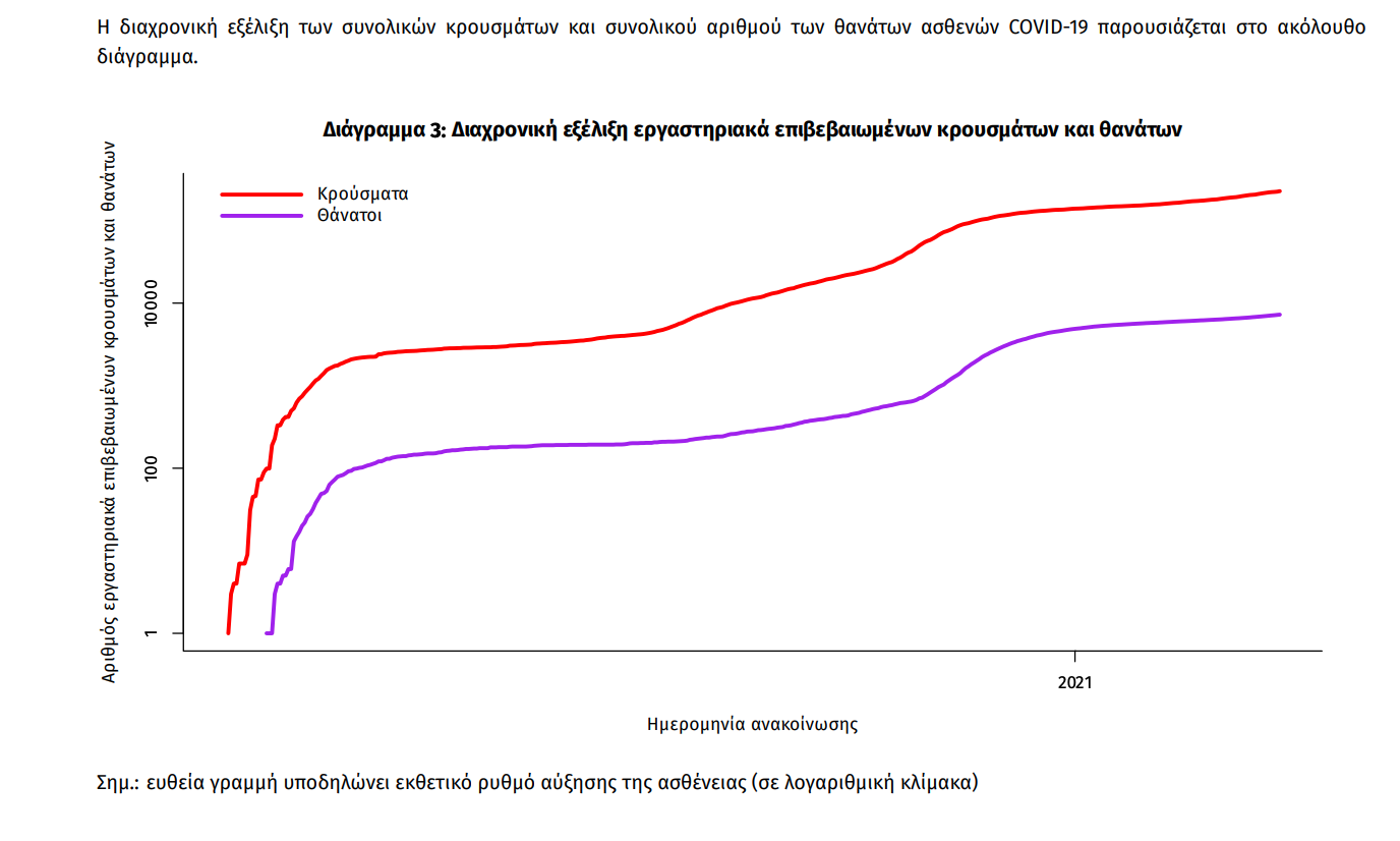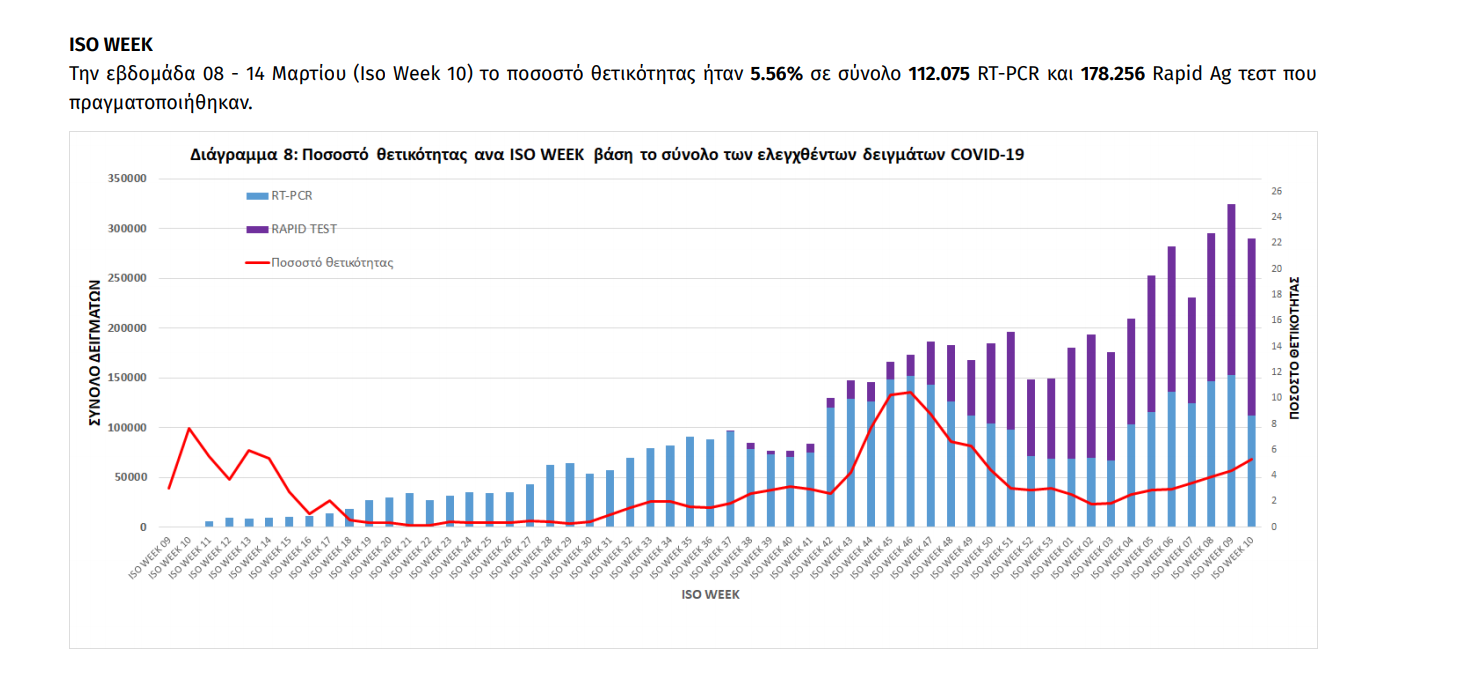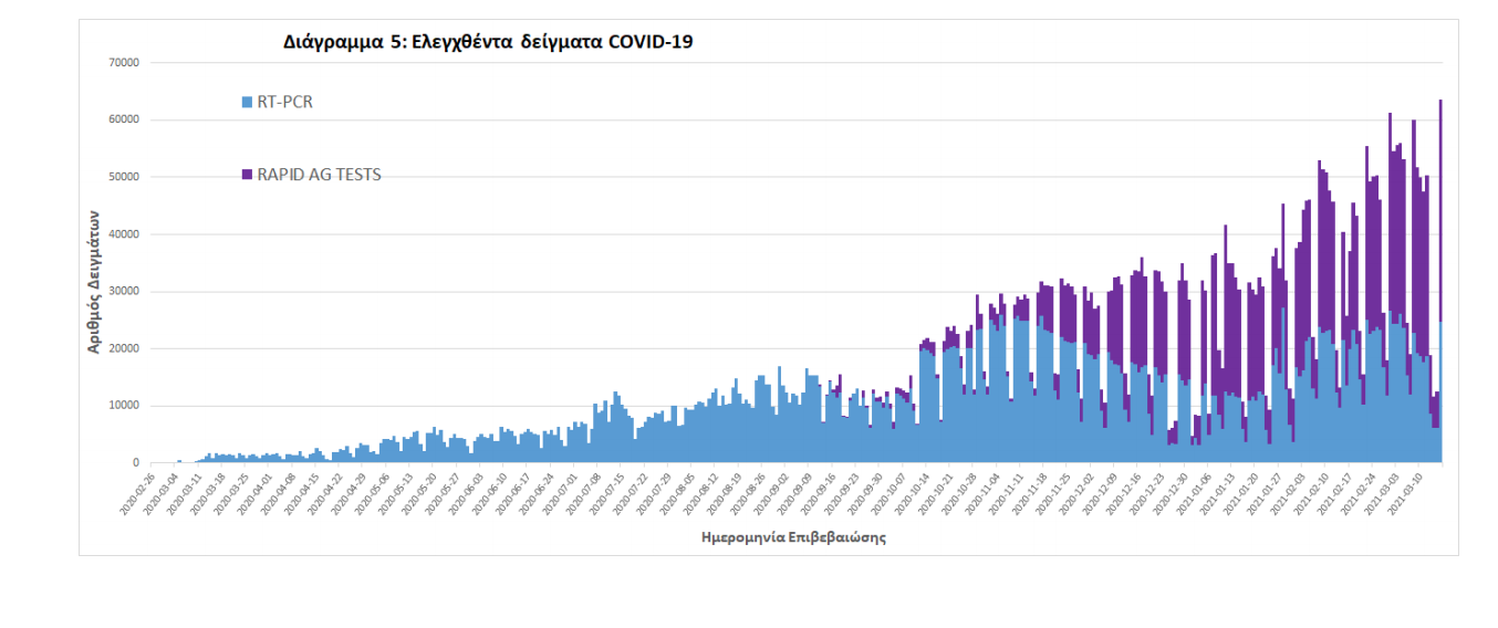 Δείγματα που έχουν ελεγχθεί: Από την 1η Ιανουαρίου 2020 μέχρι σήμερα, στα εργαστήρια που διενεργούν ελέγχους για τον νέο κορωνοϊό (SARS-CoV-2) και που δηλώνουν συστηματικά το σύνολο των δειγμάτων που ελέγχουν, έχουν συνολικά ελεγχθεί 3.956.130 κλινικά δείγματα ενώ από Μονάδες Υγείας και Κλιμάκια του ΕΟΔΥ που διενεργούν ελέγχους Rapid Ag έχουν ελεγχθεί 1.988.315 δείγματα. O μέσος όρος του επταημέρου είναι 36.375 δειγματοληπτικοί έλεγχοι.