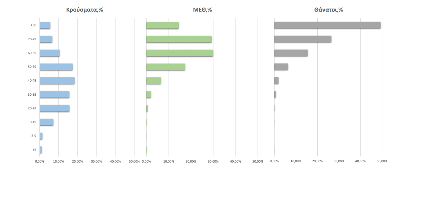 Ακολούθως παρουσιάζεται η ηλικιακή κατανομή των (α) συνολικών κρουσμάτων, (β) των περιστατικών που κατέληξαν σε θάνατο και (γ) των ασθενών που νοσηλεύονται διασωληνωμένοι: