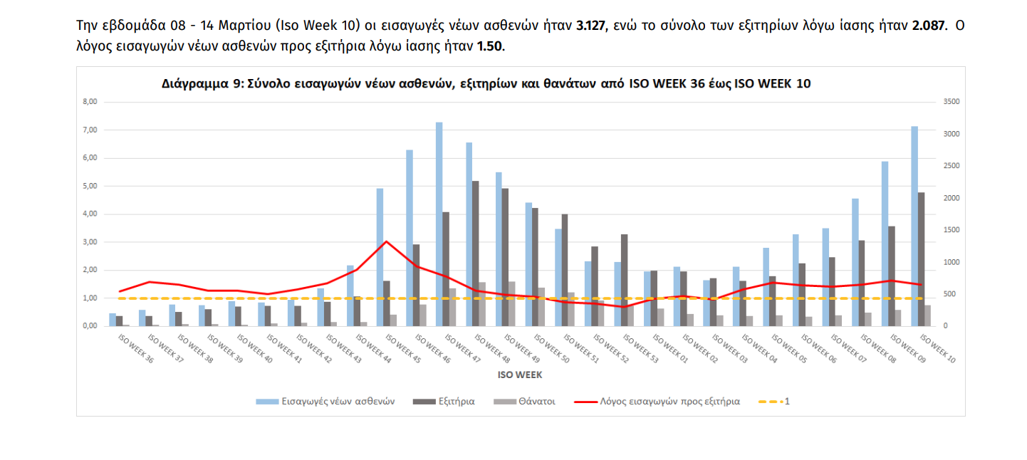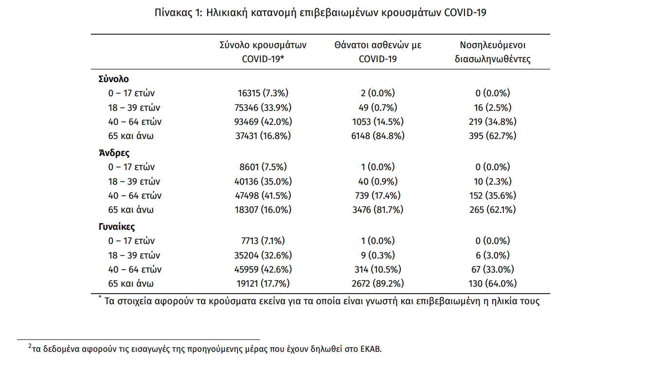 Ο αριθμός των ασθενών που νοσηλεύονται διασωληνωμένοι είναι 630 (67.9% άνδρες). Η διάμεση ηλικία τους είναι 68 έτη. To 81.9% έχει υποκείμενο νόσημα ή/και ηλικία 70 ετών και άνω. Από την αρχή της πανδημίας έχουν εξέλθει από τις ΜΕΘ 1.516 ασθενείς. Οι εισαγωγές2 νέων ασθενών Covid-19 στα νοσοκομεία της επικράτειας είναι 406 (ημερήσια μεταβολή -8.97%). Ο μέσος όρος εισαγωγών του επταημέρου είναι 449 ασθενείς.Η διάμεση ηλικία των κρουσμάτων είναι 44 έτη (εύρος 0.2 έως 105 έτη), ενώ η διάμεση ηλικία των θανόντων είναι 79 έτη (εύρος 0 έως 103 έτη). Διάγραμμα 4: Ηλικιακή Κατανομή κρουσμάτων, νοσηλευόμενων στις MEΘ και ασθενών που απεβίωσαν από την αρχή της πανδημίας