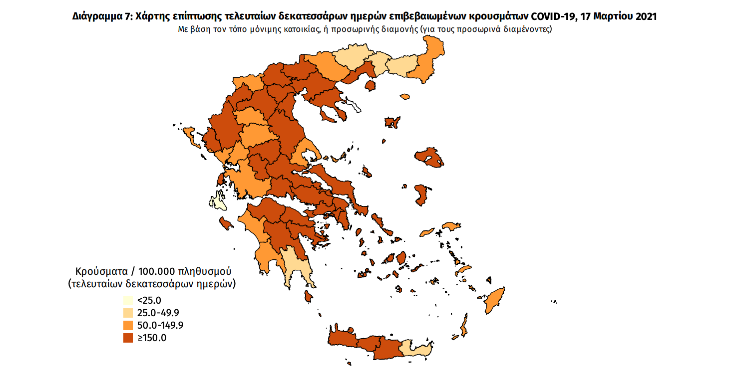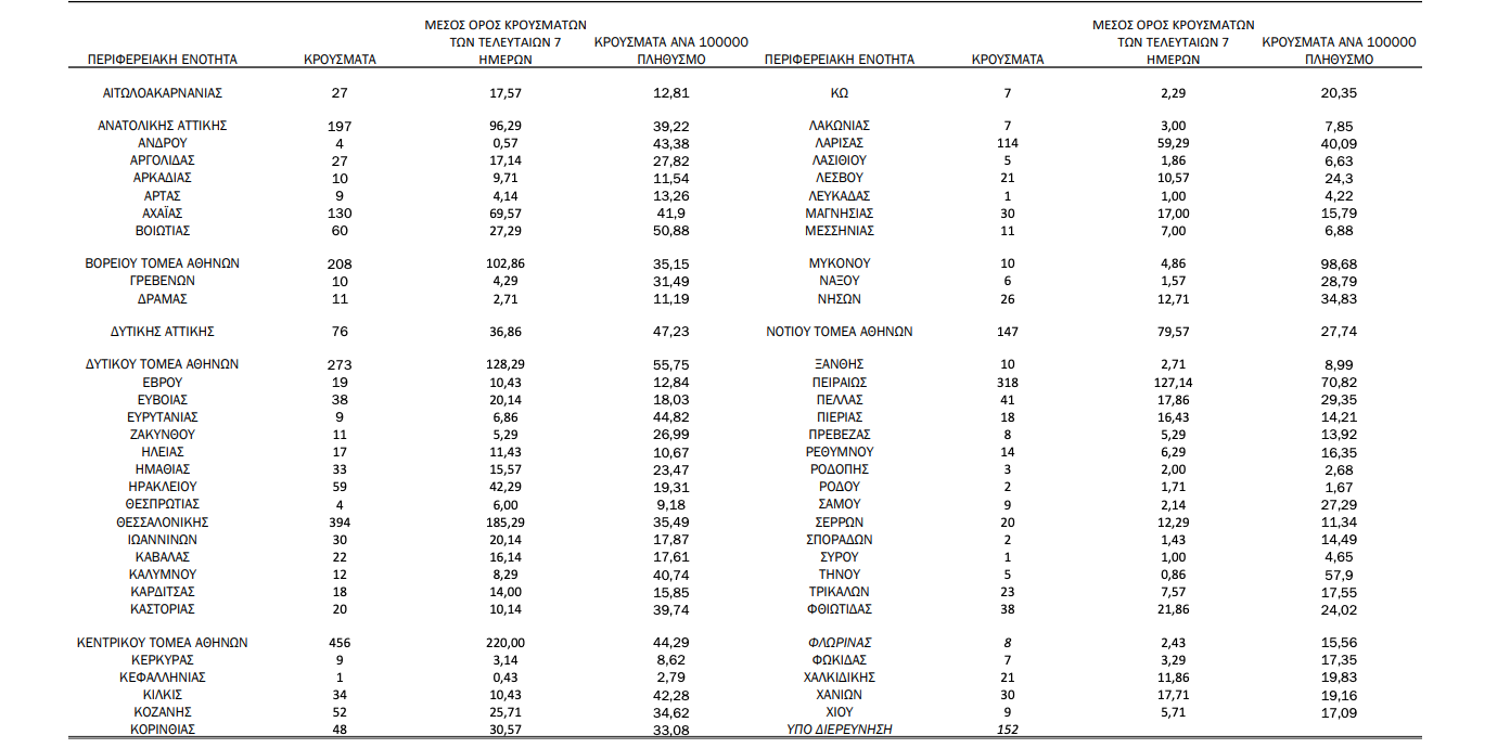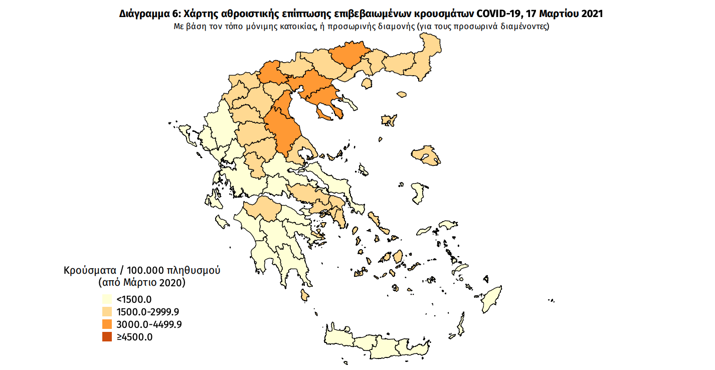 Γεωγραφική διασπορά: Ο χάρτης αποτυπώνει τη γεωγραφική κατανομή των συνολικών κρουσμάτων COVID-19 (από την αρχή της επιδημίας) ανά Περιφερειακή Ενότητα της χώρας, με βάση την δηλωθείσα διεύθυνση μόνιμης κατοικίας του ασθενούς, ή τη διεύθυνση προσωρινής διαμονής για τους τουρίστες και άλλους προσωρινά διαμένοντες στην Ελλάδα. Συμπεριλαμβάνονται τόσο κρούσματα με ιστορικό ταξιδίου (“εισαγόμενα”) όσο και κρούσματα με πιθανή εγχώρια μετάδοση.
