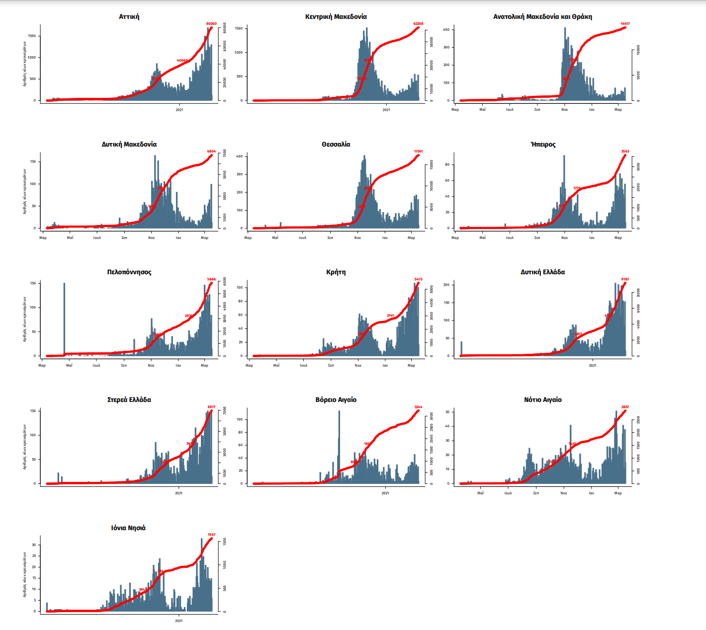 Παράρτημα 1: Επιδημικές καμπύλες κρουσμάτων COVID-19 με βάση την δηλωθείσα διεύθυνση μόνιμης κατοικίας του κρούσματος ή τη διεύθυνση προσωρινής διαμονής για τους τουρίστες και άλλους προσωρινά διαμένοντες στην Ελλάδα. Συμπεριλαμβάνονται τόσο κρούσματα με ιστορικό ταξιδίου όσο και κρούσματα με πιθανή εγχώρια μετάδοση.