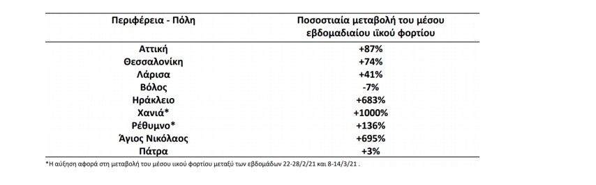 Παράρτημα 2: ΕΘΝΙΚΟ ΔΙΚΤΥΟ ΕΠΙΔΗΜΙΟΛΟΓΙΑΣ ΛΥΜΑΤΩΝ ΕΟΔΥ Ανακοινώνονται τα αποτελέσματα των εργαστηριακών ελέγχων του Εθνικού Δικτύου Επιδημιολογίας Λυμάτων το οποίο λειτουργεί υπό τον συντονισμό του ΕΟΔΥ για την επιδημιολογική επιτήρηση του ιού SARS-CoV-2 σε αστικά λύματα που αφορούν την περίοδο από 8 έως 14 Μαρτίου 2021. Τα δείγματα προέρχονται από την Περιφέρεια Αττικής και τις πόλεις της Θεσσαλονίκης, της Λάρισας, του Βόλου, του Ηρακλείου, των Χανίων, του Ρεθύμνου, του Αγίου Νικολάου και της Πάτρας. Τα δείγματα λαμβάνονται από τις εισόδους των εκάστοτε Μονάδων Επεξεργασίας Λυμάτων και αντιστοιχούν στον πληθυσμό που εξυπηρετείται από αυτές. Πίνακας 1: Ποσοστιαία μεταβολή στη μέση εβδομαδιαία συγκέντρωση του ιικού φορτίου του SARS-CoV-2 στα αστικά λύματα ανά 100.000 κατοίκους την εβδομάδα 8-14 Μαρτίου 2021 σε σχέση με την εβδομάδα 1-7 Μαρτίου 2021