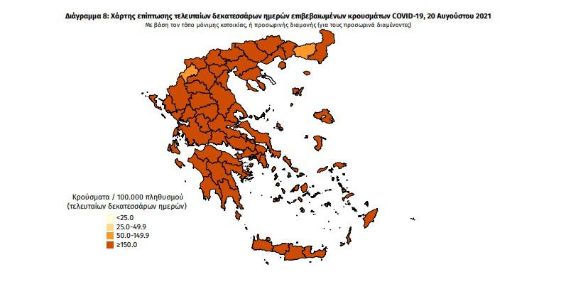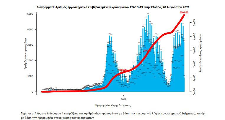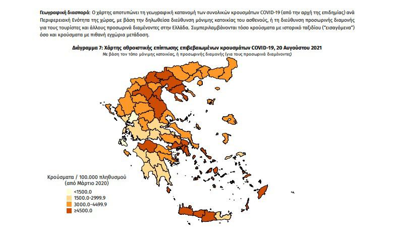 Τα στοιχεία που παρουσιάζονται αφορούν περιστατικά από την επιδημιολογική επιτήρηση της νόσου από το νέο κορωνοϊό (COVID19), με βάση τα δεδομένα που έχουν δηλωθεί στον ΕΟΔΥ και καταγραφεί μέχρι τις 20 Αυγούστου 2021 (ώρα 15:00).