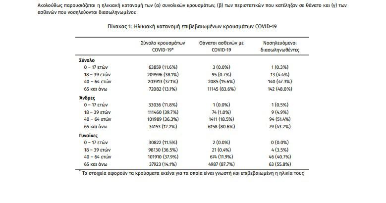 Τα νέα εργαστηριακά επιβεβαιωμένα κρούσματα της νόσου που καταγράφηκαν τις τελευταίες 24 ώρες είναι 3.625 , εκ των οποίων 16 εντοπίστηκαν κατόπιν ελέγχων στις πύλες εισόδου της χώρας. Ο συνολικός αριθμός των κρουσμάτων ανέρχεται σε 554.055 (ημερήσια μεταβολή +0.7%), εκ των οποίων 51.1% άνδρες.