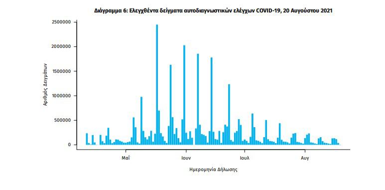 Αυτοδιαγνωστικοί έλεγχοι (Self-tests): Έως 19 Αυγούστου 2021, έχουν καταγραφεί ηλεκτρονικά 31.969.789 δηλώσεις αποτελέσματος αυτοδιαγνωστικού ελέγχου, ενώ 1.062.707 άτομα προσήλθαν για επανέλεγχο.