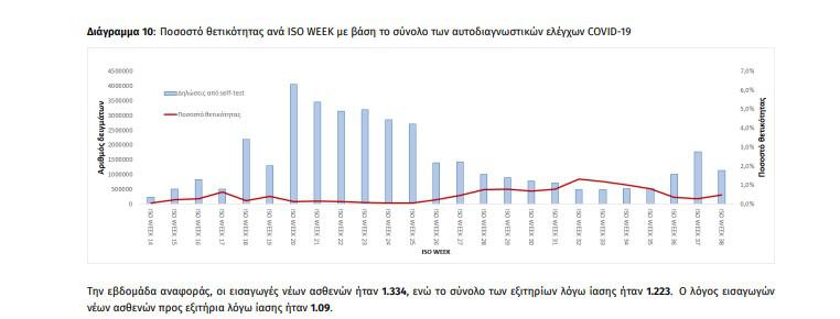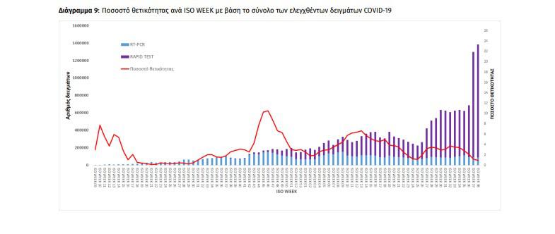 Την εβδομάδα αναφοράς, το ποσοστό θετικότητας ήταν 1.01% σε σύνολο 1.383.029 εργαστηριακών ελέγχων (RT-PCR/Rapid-Ag) και 0.48% σε σύνολο 1.143.810 αυτοδιαγνωστικών ελέγχων. Στο σύνολο των ελέγχων, το ποσοστό θετικότητας ήταν 0.55%.