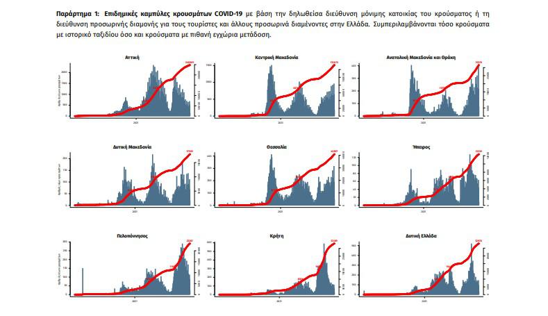 Με βάση τα επιβεβαιωμένα κρούσματα των τελευταίων 7 ημερών, 77 θεωρούνται σχετιζόμενα με ταξίδι από το εξωτερικό και 3.183 είναι σχετιζόμενα με ήδη γνωστό κρούσμα. To για την επικράτεια βάσει των κρουσμάτων εκτιμάται σε 0.95 (95% ΔΕ: 0.89 – 1.00)
