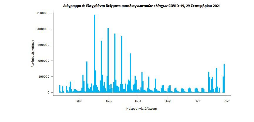 Αυτοδιαγνωστικοί έλεγχοι (Self-tests): Έως 28 Σεπτεμβρίου 2021, έχουν καταγραφεί ηλεκτρονικά 38.534.953 δηλώσεις αποτελέσματος αυτοδιαγνωστικού ελέγχου. Από τα 2.260.768 άτομα που προσήλθαν για επανέλεγχο, έχουν καταγραφεί 109.034 θετικά αποτελέσματα.