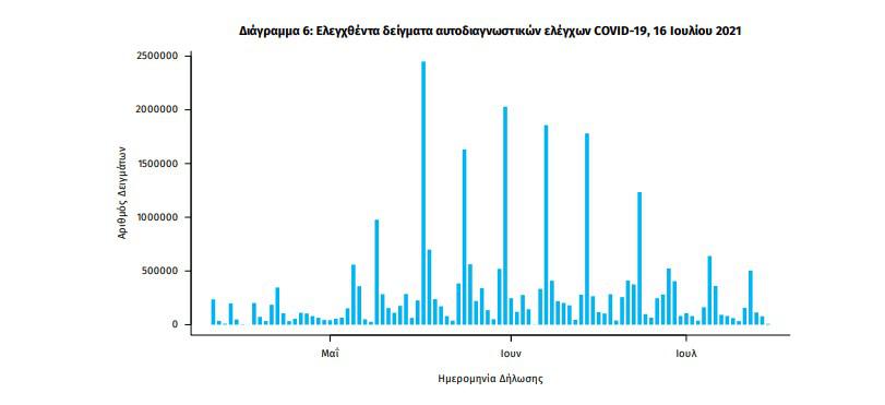 Αυτοδιαγνωστικοί έλεγχοι (Self-tests): Έως 15 Ιουλίου 2021, έχουν καταγραφεί ηλεκτρονικά 28.503.883 δηλώσεις αποτελέσματος αυτοδιαγνωστικού ελέγχου, ενώ 629.552 άτομα προσήλθαν για επανέλεγχο.