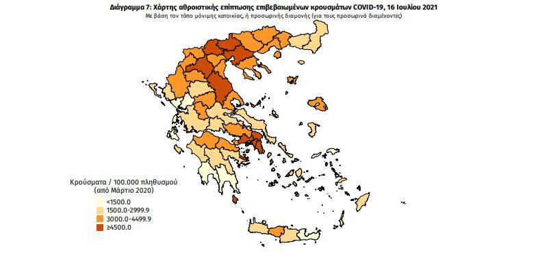 Γεωγραφική διασπορά: Ο χάρτης αποτυπώνει τη γεωγραφική κατανομή των συνολικών κρουσμάτων COVID-19 (από την αρχή της επιδημίας) ανά Περιφερειακή Ενότητα της χώρας, με βάση την δηλωθείσα διεύθυνση μόνιμης κατοικίας του ασθενούς, ή τη διεύθυνση προσωρινής διαμονής για τους τουρίστες και άλλους προσωρινά διαμένοντες στην Ελλάδα. Συμπεριλαμβάνονται τόσο κρούσματα με ιστορικό ταξιδίου (“εισαγόμενα”) όσο και κρούσματα με πιθανή εγχώρια μετάδοση.