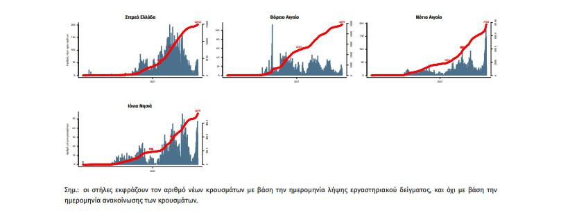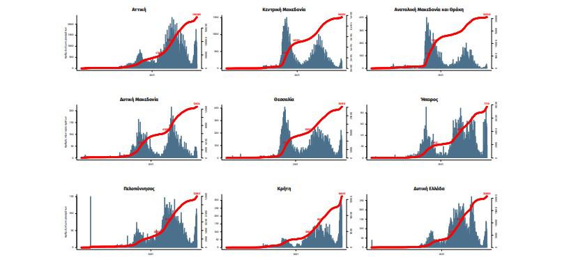 Παράρτημα 1: Επιδημικές καμπύλες κρουσμάτων COVID-19 με βάση την δηλωθείσα διεύθυνση μόνιμης κατοικίας του κρούσματος ή τη διεύθυνση προσωρινής διαμονής για τους τουρίστες και άλλους προσωρινά διαμένοντες στην Ελλάδα. Συμπεριλαμβάνονται τόσο κρούσματα με ιστορικό ταξιδίου όσο και κρούσματα με πιθανή εγχώρια μετάδοση.