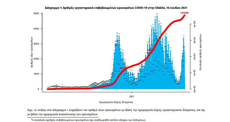 Τα νέα εργαστηριακά επιβεβαιωμένα κρούσματα της νόσου που καταγράφηκαν τις τελευταίες 24 ώρες είναι 2.691 , εκ των οποίων 11 εντοπίστηκαν κατόπιν ελέγχων στις πύλες εισόδου της χώρας. Ο συνολικός αριθμός των κρουσμάτων ανέρχεται σε 453.200 (ημερήσια μεταβολή +0.6%), εκ των οποίων 51.2% άνδρες. 1 Με βάση τα επιβεβαιωμένα κρούσματα των τελευταίων 7 ημερών, 167 θεωρούνται σχετιζόμενα με ταξίδι από το εξωτερικό και 1.721 είναι σχετιζόμενα με ήδη γνωστό κρούσμα. Ημερήσια εξέλιξη της πανδημίας: Η ημερήσια κατανομή των επιβεβαιωμένων κρουσμάτων είναι η ακόλουθη (η γραμμή παριστάνει την συνολική, αθροιστική κατανομή των κρουσμάτων).