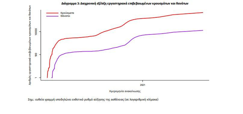 Η διαχρονική εξέλιξη των συνολικών κρουσμάτων και συνολικού αριθμού των θανάτων ασθενών COVID-19 παρουσιάζεται στο ακόλουθο διάγραμμα.