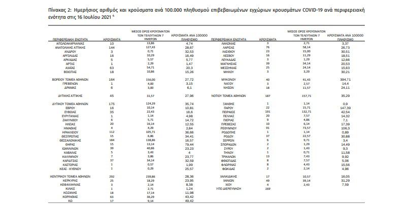 Κατανομή ανακοινωθέντων εγχώριων κρουσμάτων: Από το σύνολο των 2.691 νέων κρουσμάτων του νέου ιού στη χώρα 24 είναι εισαγόμενα εκ των οποίων 11 εντοπίστηκαν κατόπιν ελέγχων στις πύλες εισόδου της χώρας . Η κατανομή των 2.667 νέων εγχώριων κρουσμάτων ανά Περιφερειακή Ενότητα παρουσιάζεται στον κατωτέρω πίνακα: