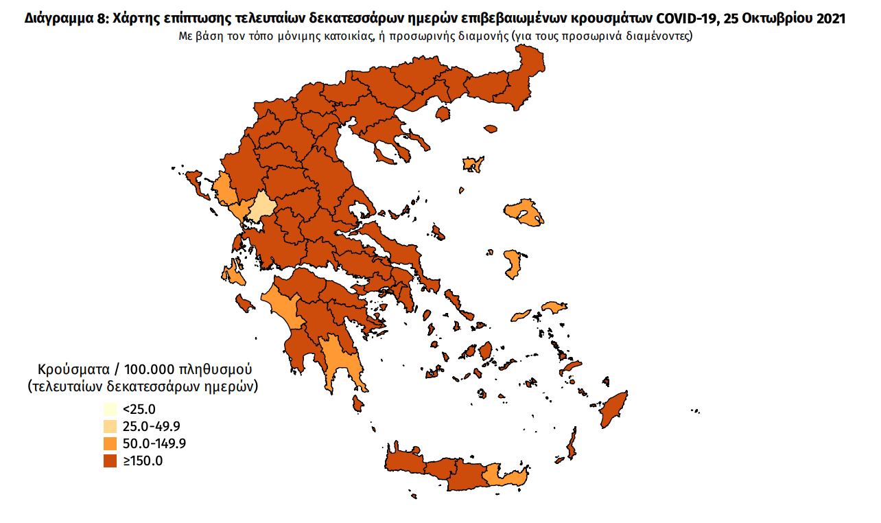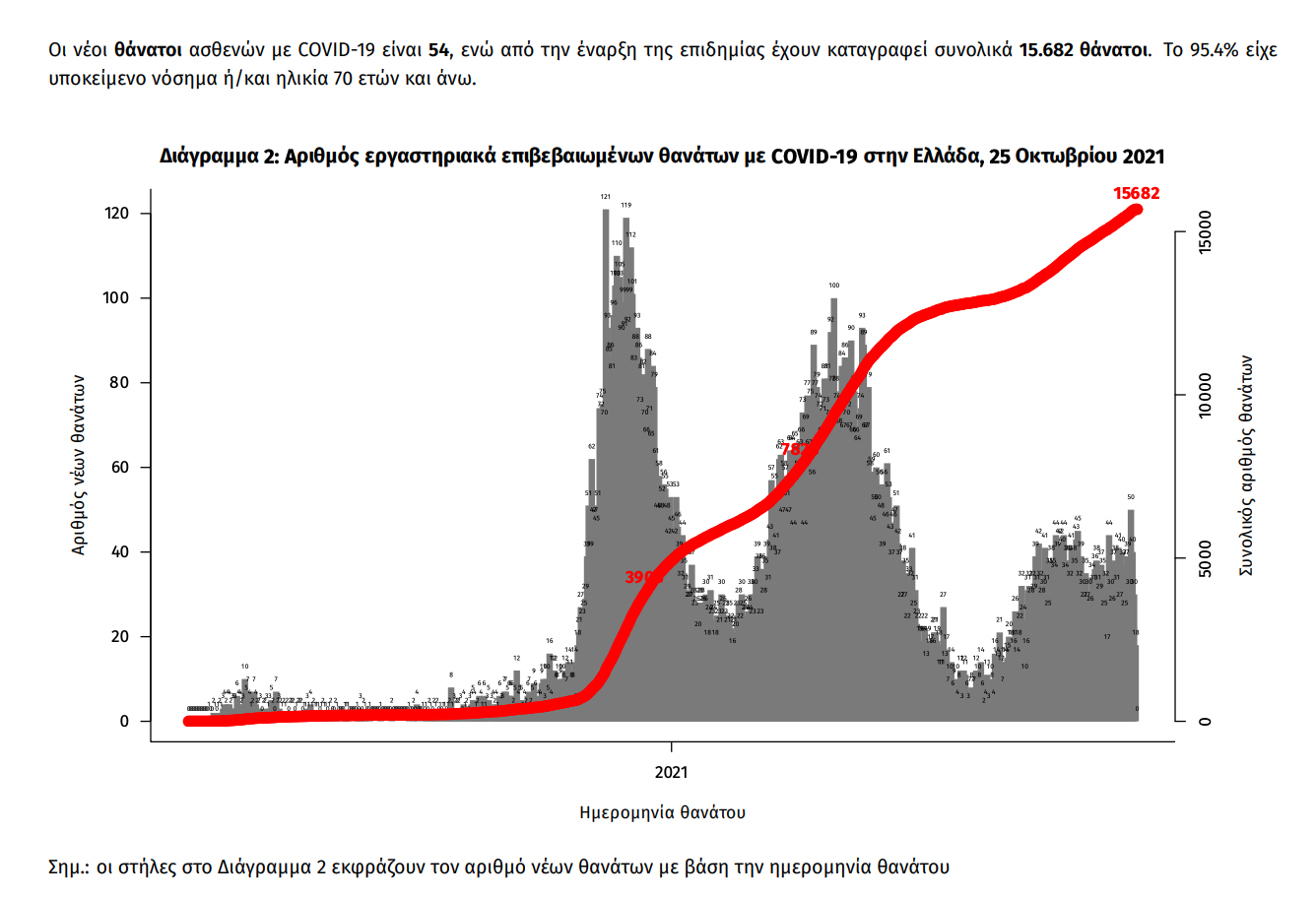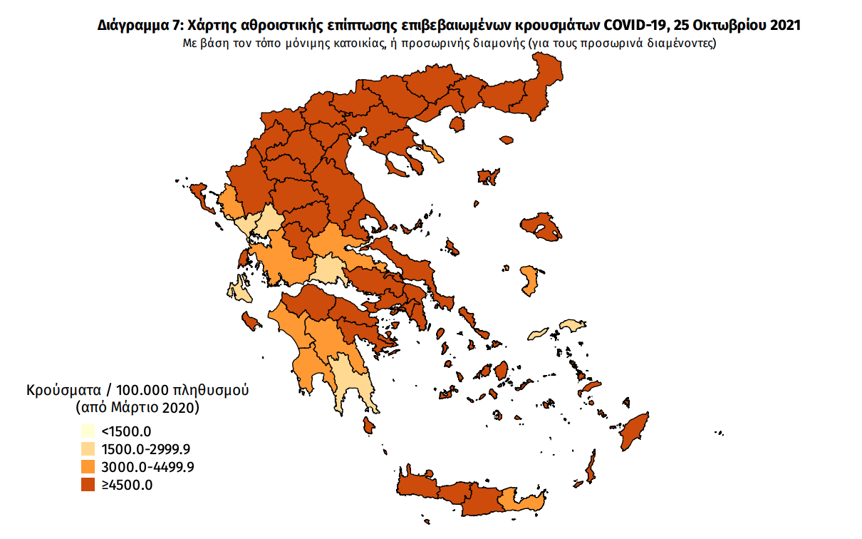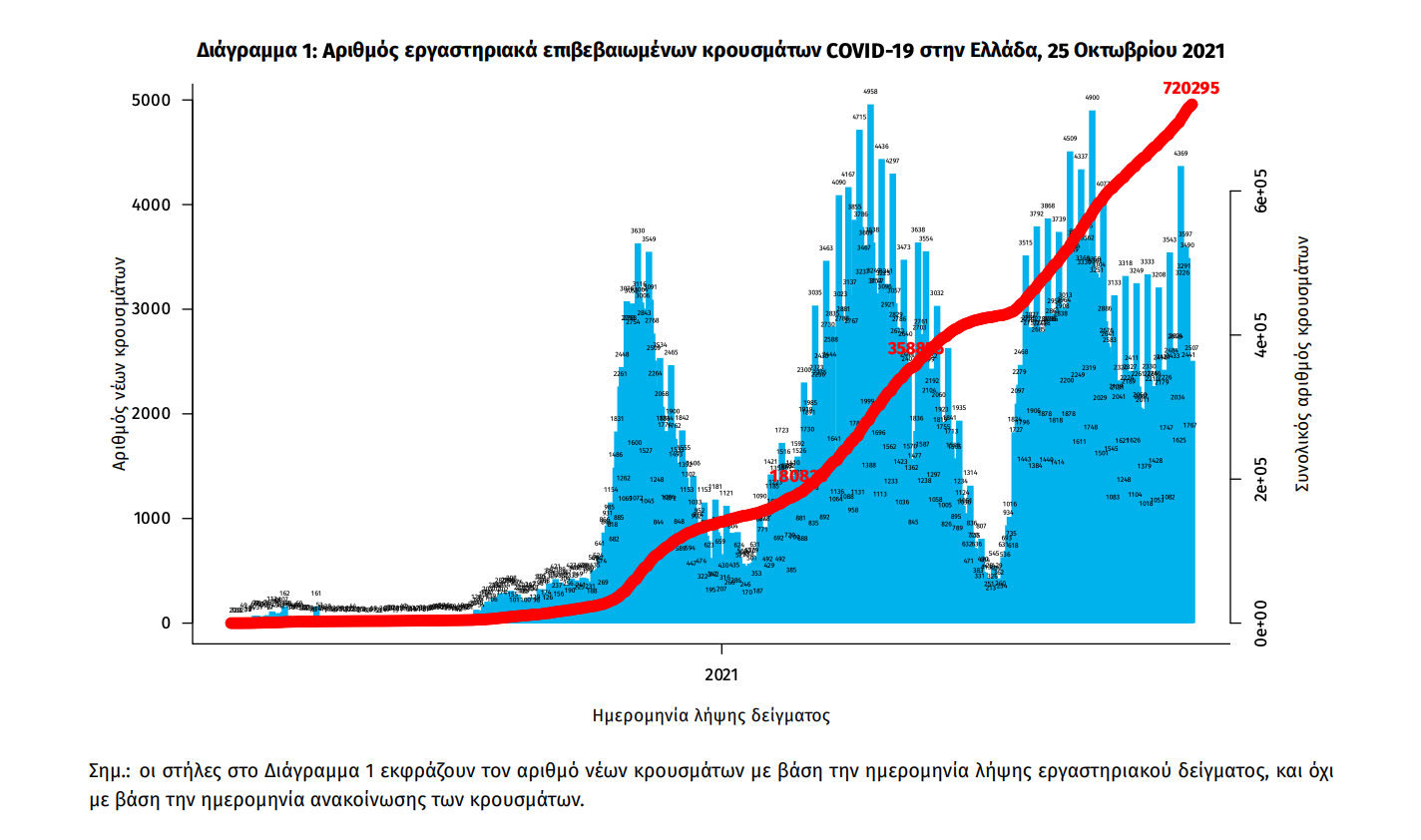 Τα στοιχεία που παρουσιάζονται αφορούν περιστατικά από την επιδημιολογική επιτήρηση της νόσου από το νέο κορωνοϊό (COVID19), με βάση τα δεδομένα που έχουν δηλωθεί στον ΕΟΔΥ και καταγραφεί μέχρι τις 25 Οκτωβρίου 2021 (ώρα 15:00). Τα νέα εργαστηριακά επιβεβαιωμένα κρούσματα της νόσου που καταγράφηκαν τις τελευταίες 24 ώρες είναι 3.937 , εκ των οποίων 11 εντοπίστηκαν κατόπιν ελέγχων στις πύλες εισόδου της χώρας.