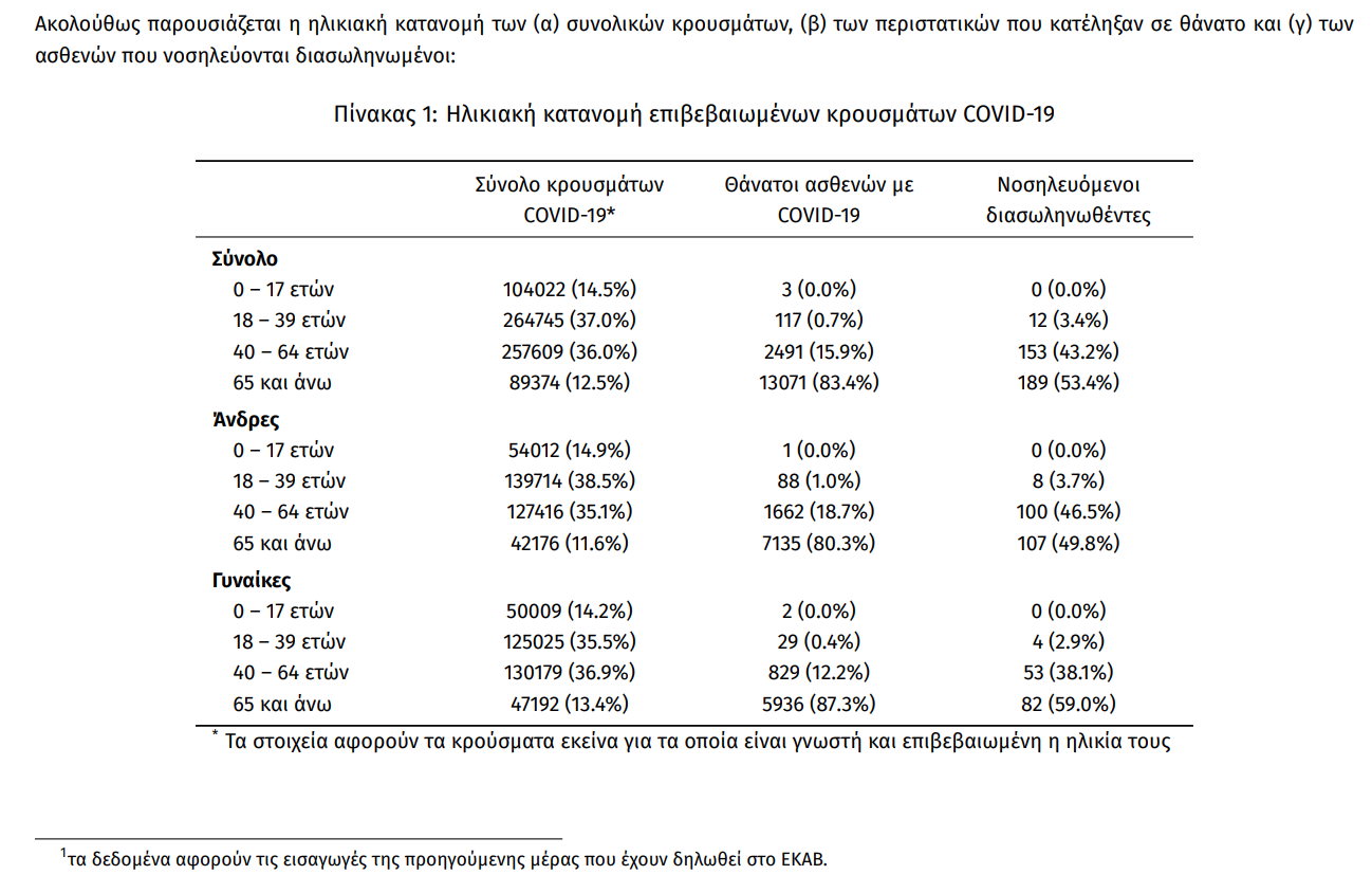 Ο αριθμός των ασθενών που νοσηλεύονται διασωληνωμένοι είναι 354 (61.0% άνδρες). Η διάμεση ηλικία τους είναι 66 έτη. To 79.4% έχει υποκείμενο νόσημα ή/και ηλικία 70 ετών και άνω. Μεταξύ των ασθενών που νοσηλεύονται διασωληνωμένοι, 314 (88.7%) είναι ανεμβολίαστοι ή μερικώς εμβολιασμένοι και 40 (11.3%) είναι πλήρως εμβολιασμένοι. Από την αρχή της πανδημίας έχουν εξέλθει από τις ΜΕΘ 3.285 ασθενείς. Οι εισαγωγές1 νέων ασθενών Covid-19 στα νοσοκομεία της επικράτειας είναι 219 (ημερήσια μεταβολή -13.44%). Ο μέσος όρος εισαγωγών του επταημέρου είναι 227 ασθενείς.Η διάμεση ηλικία των κρουσμάτων είναι 39 έτη (εύρος 0.2 έως 106 έτη), ενώ η διάμεση ηλικία των θανόντων είναι 78 έτη (εύρος 0.2 έως 106 έτη). Διάγραμμα 4: Ηλικιακή Κατανομή κρουσμάτων, νοσηλευόμενων στις MEΘ και ασθενών που απεβίωσαν από την αρχή της πανδημίας.