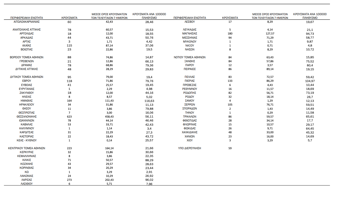 Κατανομή ανακοινωθέντων εγχώριων κρουσμάτων: Από το σύνολο των 3.937 νέων κρουσμάτων του νέου ιού στη χώρα 16 είναι εισαγόμενα εκ των οποίων 11 εντοπίστηκαν κατόπιν ελέγχων στις πύλες εισόδου της χώρας . Η κατανομή των 3.921 νέων εγχώριων κρουσμάτων ανά Περιφερειακή Ενότητα παρουσιάζεται στον κατωτέρω πίνακα.2 Πίνακας 2: Ημερήσιος αριθμός και κρούσματα ανά 100.000 πληθυσμού επιβεβαιωμένων εγχώριων κρουσμάτων COVID-19 ανά περιφερειακή ενότητα στις 25 Οκτωβρίου 2021