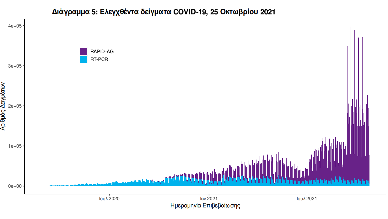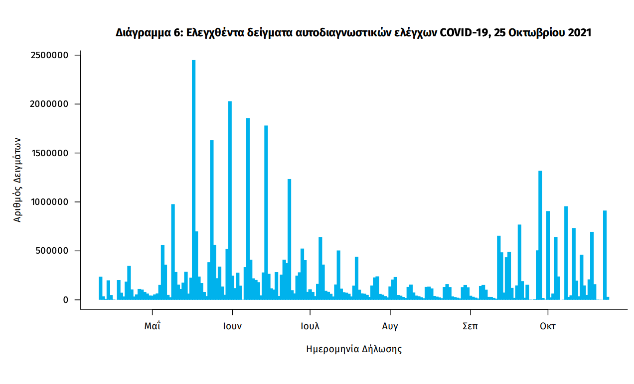 Δείγματα που έχουν ελεγχθεί: Από την 1η Ιανουαρίου 2020 μέχρι σήμερα, στα εργαστήρια που διενεργούν ελέγχους για τον νέο κορωνοϊό (SARS-CoV-2) και που δηλώνουν συστηματικά το σύνολο των δειγμάτων που ελέγχουν, έχουν συνολικά ελεγχθεί 6.922.835 κλινικά δείγματα ενώ από Μονάδες Υγείας και Κλιμάκια του ΕΟΔΥ που διενεργούν ελέγχους Rapid Ag έχουν ελεγχθεί 17.815.277 δείγματα. O μέσος όρος του επταημέρου είναι 199.075 δειγματοληπτικοί έλεγχοι. Αυτοδιαγνωστικοί έλεγχοι (Self-tests): Έως 24 Οκτωβρίου 2021, έχουν καταγραφεί ηλεκτρονικά 45.516.856 δηλώσεις αποτελέσματος αυτοδιαγνωστικού ελέγχου, ενώ 2.601.027 άτομα προσήλθαν για επανέλεγχο. Mαζικές Δειγματοληψίες ΕΟΔΥ: Στις 24 Οκτωβρίου 2021, πραγματοποιήθηκαν 36 δράσεις δειγματοληπτικών ελέγχων από τις Κινητές Ομάδες Υγείας (ΚΟΜΥ) του ΕΟΔΥ, στις οποίες διενεργήθηκαν 7.875 έλεγχοι Rapid Ag και ανευρέθηκαν 348 θετικά (4,42%).