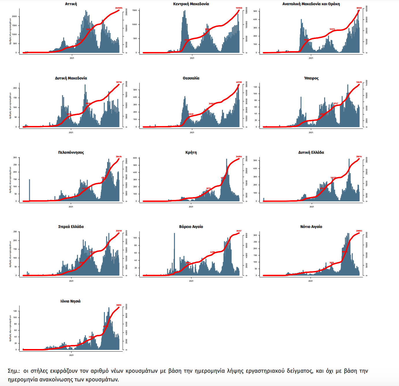 Παράρτημα 1: Επιδημικές καμπύλες κρουσμάτων COVID-19 με βάση την δηλωθείσα διεύθυνση μόνιμης κατοικίας του κρούσματος ή τη διεύθυνση προσωρινής διαμονής για τους τουρίστες και άλλους προσωρινά διαμένοντες στην Ελλάδα. Συμπεριλαμβάνονται τόσο κρούσματα με ιστορικό ταξιδίου όσο και κρούσματα με πιθανή εγχώρια μετάδοση.