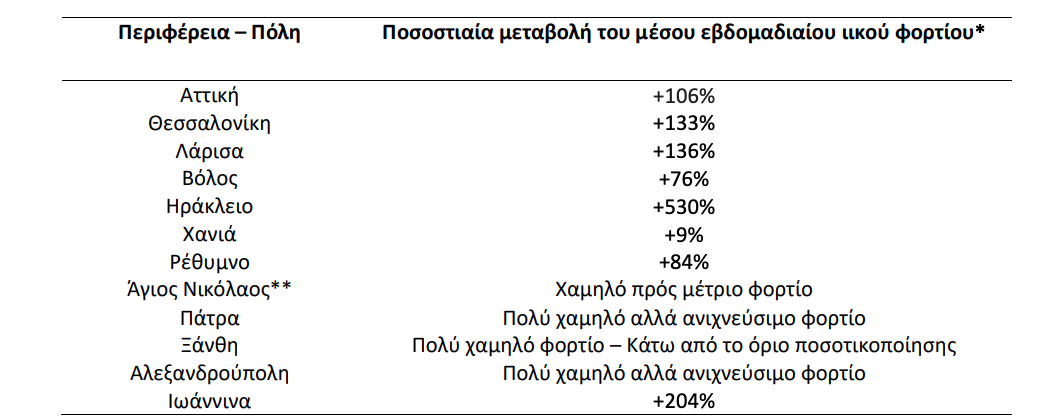 Οι αυξητικές μεταβολές κυμάνθηκαν από +76% στο Βόλο έως +530% στο Ηράκλειο. Σταθερό παρέμεινε το ιικό φορτίο στα Χανιά (+9%). Στην Πάτρα και στην Αλεξανδρούπολη το ιικό φορτίο παρέμεινε χαμηλό αλλά ανιχνεύσιμο, δηλαδή τα επίπεδα ήταν πάνω από το όριο ποσοτικοποίησης της μεθόδου. Στην Ξάνθη, το ιικό φορτίο των αστικών λυμάτων παρέμεινε πολύ χαμηλό και κάτω από το όριο ποσοτικοποίησης της μεθόδου.