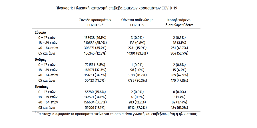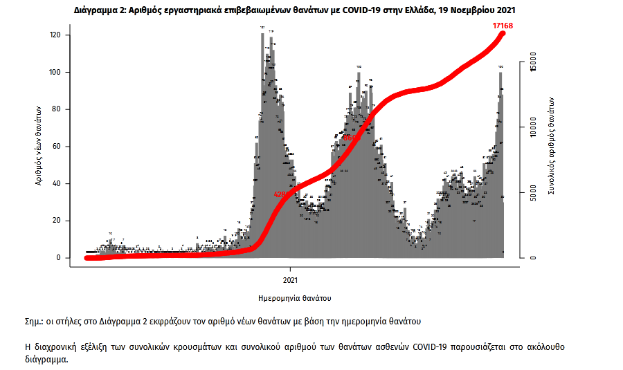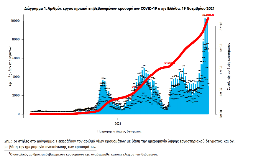 Τα στοιχεία που παρουσιάζονται αφορούν περιστατικά από την επιδημιολογική επιτήρηση της νόσου από το νέο κορωνοϊό (COVID- 19), με βάση τα δεδομένα που έχουν δηλωθεί στον ΕΟΔΥ και καταγραφεί μέχρι τις 19 Νοεμβρίου 2021 (ώρα 15:00). Τα νέα εργαστηριακά επιβεβαιωμένα κρούσματα της νόσου που καταγράφηκαν τις τελευταίες 24 ώρες είναι 7.805 , εκ των οποίων 11 εντοπίστηκαν κατόπιν ελέγχων στις πύλες εισόδου της χώρας. Ο συνολικός αριθμός των κρουσμάτων ανέρχεται σε 868.868 (ημερήσια μεταβολή +0.9%), εκ των οποίων 50.7% άνδρες.1 Με βάση τα επιβεβαιωμένα κρούσματα των τελευταίων 7 ημερών, 113 θεωρούνται σχετιζόμενα με ταξίδι από το εξωτερικό και 3.204 είναι σχετιζόμενα με ήδη γνωστό κρούσμα.