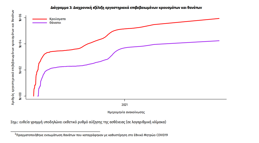 Ημερήσια εξέλιξη της πανδημίας: Η ημερήσια κατανομή των επιβεβαιωμένων κρουσμάτων είναι η ακόλουθη (η γραμμή παριστάνει την συνολική, αθροιστική κατανομή των κρουσμάτων).
