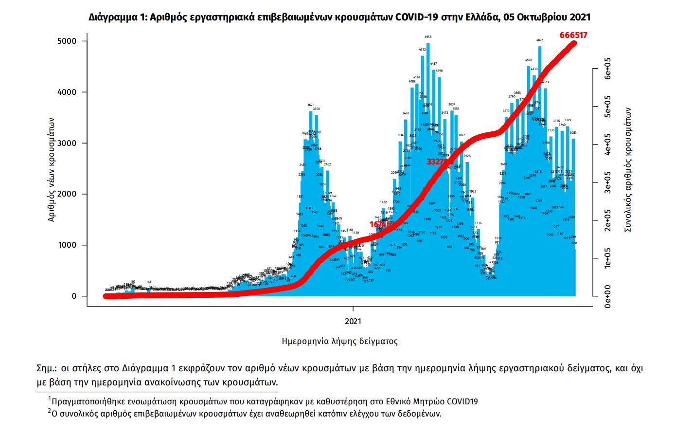 Ο συνολικός αριθμός των κρουσμάτων ανέρχεται σε 666.517 (ημερήσια μεταβολή +0.5%), εκ των οποίων 50.9% άνδρες. 1 2 Με βάση τα επιβεβαιωμένα κρούσματα των τελευταίων 7 ημερών, 99 θεωρούνται σχετιζόμενα με ταξίδι από το εξωτερικό και 2.837 είναι σχετιζόμενα με ήδη γνωστό κρούσμα. Ημερήσια εξέλιξη της πανδημίας: Η ημερήσια κατανομή των επιβεβαιωμένων κρουσμάτων είναι η ακόλουθη (η γραμμή παριστάνει την συνολική, αθροιστική κατανομή των κρουσμάτων).