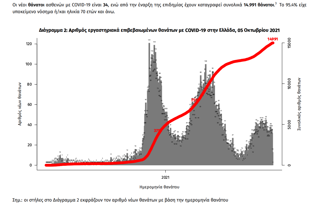 Τα στοιχεία που παρουσιάζονται αφορούν περιστατικά από την επιδημιολογική επιτήρηση της νόσου από το νέο κορωνοϊό (COVID19), με βάση τα δεδομένα που έχουν δηλωθεί στον ΕΟΔΥ και καταγραφεί μέχρι τις 05 Οκτωβρίου 2021 (ώρα 15:00). Τα νέα εργαστηριακά επιβεβαιωμένα κρούσματα της νόσου που καταγράφηκαν τις τελευταίες 24 ώρες είναι 2.876, εκ των οποίων 6 εντοπίστηκαν κατόπιν ελέγχων στις πύλες εισόδου της χώρας.