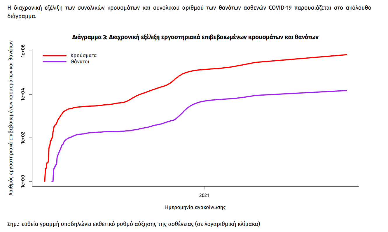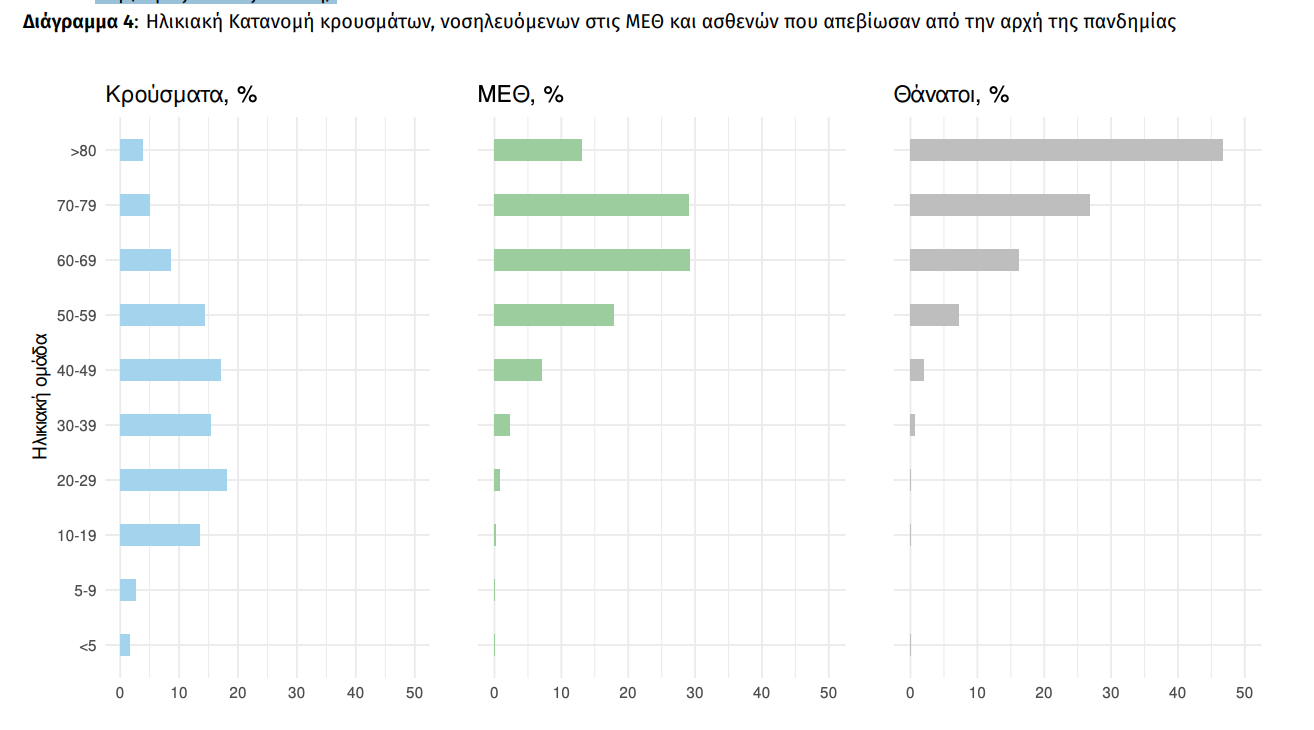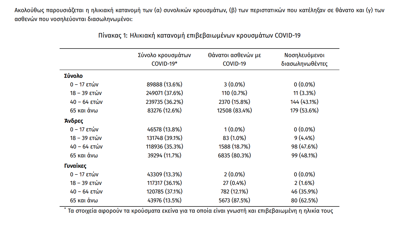 Ο αριθμός των ασθενών που νοσηλεύονται διασωληνωμένοι είναι 334 (61.4% άνδρες). Η διάμεση ηλικία τους είναι 66 έτη. To 80.5% έχει υποκείμενο νόσημα ή/και ηλικία 70 ετών και άνω. Μεταξύ των ασθενών που νοσηλεύονται διασωληνωμένοι, 300 (89.82%) είναι ανεμβολίαστοι ή μερικώς εμβολιασμένοι και 34 (10.18%) είναι πλήρως εμβολιασμένοι. Από την αρχή της πανδημίας έχουν εξέλθει από τις ΜΕΘ 3.188 ασθενείς. Οι εισαγωγές4 νέων ασθενών Covid-19 στα νοσοκομεία της επικράτειας είναι 146 (ημερήσια μεταβολή +5.8%). Ο μέσος όρος εισαγωγών του επταημέρου είναι 162 ασθενείς.Η διάμεση ηλικία των κρουσμάτων είναι 39 έτη (εύρος 0.2 έως 106 έτη), ενώ η διάμεση ηλικία των θανόντων είναι 78 έτη (εύρος 0.2 έως 106 έτη).