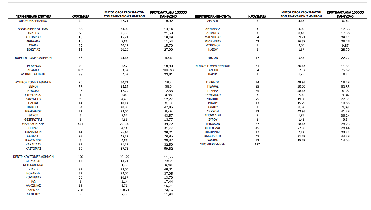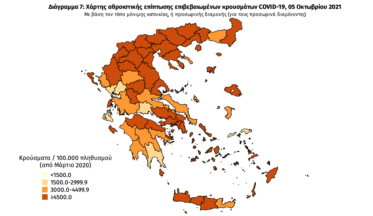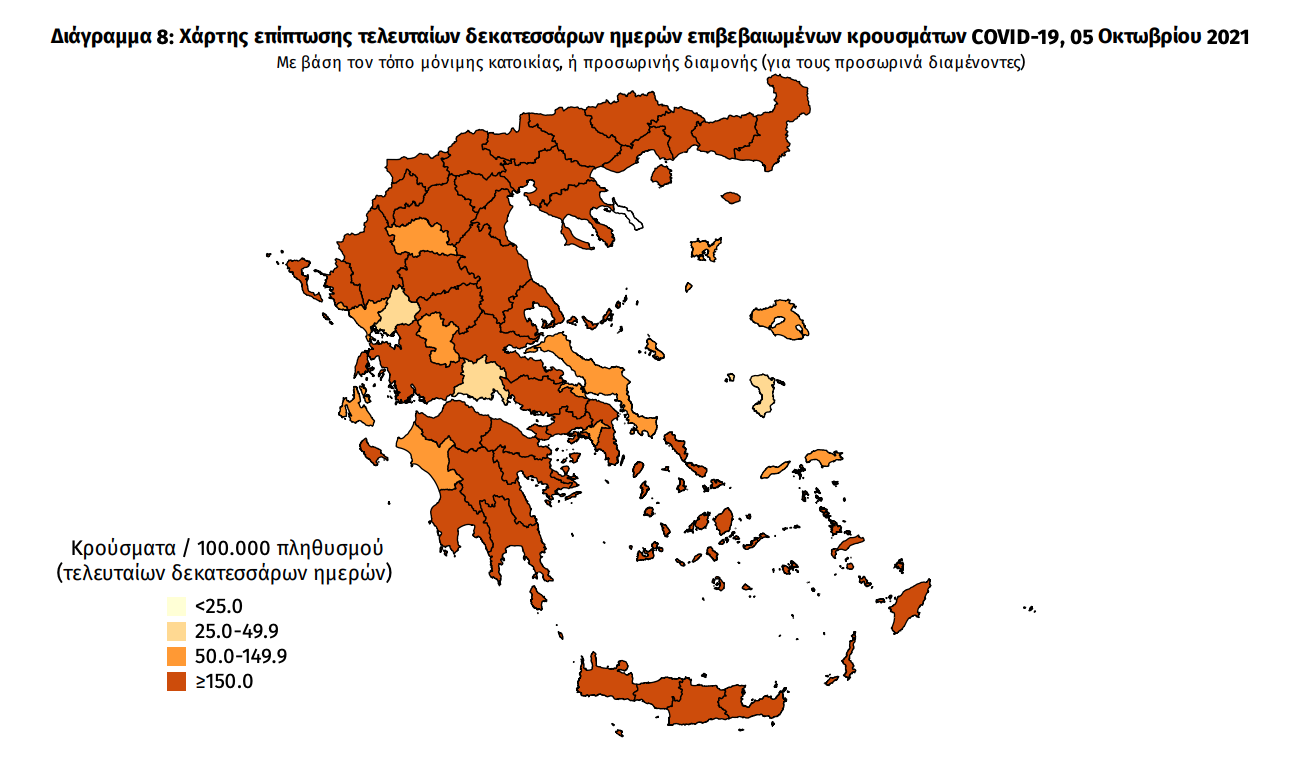 Κατανομή ανακοινωθέντων εγχώριων κρουσμάτων: Από το σύνολο των 2.876 κρουσμάτων του νέου ιού στη χώρα 14 είναι εισαγόμενα εκ των οποίων 6 εντοπίστηκαν κατόπιν ελέγχων στις πύλες εισόδου της χώρας. Η κατανομή των 2.862 νέων εγχώριων κρουσμάτων ανά Περιφερειακή Ενότητα παρουσιάζεται στον κατωτέρω πίνακα.5 Πίνακας 2: Ημερήσιος αριθμός και κρούσματα ανά 100.000 πληθυσμού επιβεβαιωμένων εγχώριων κρουσμάτων COVID-19 ανά περιφερειακή ενότητα στις 05 Οκτωβρίου 2021