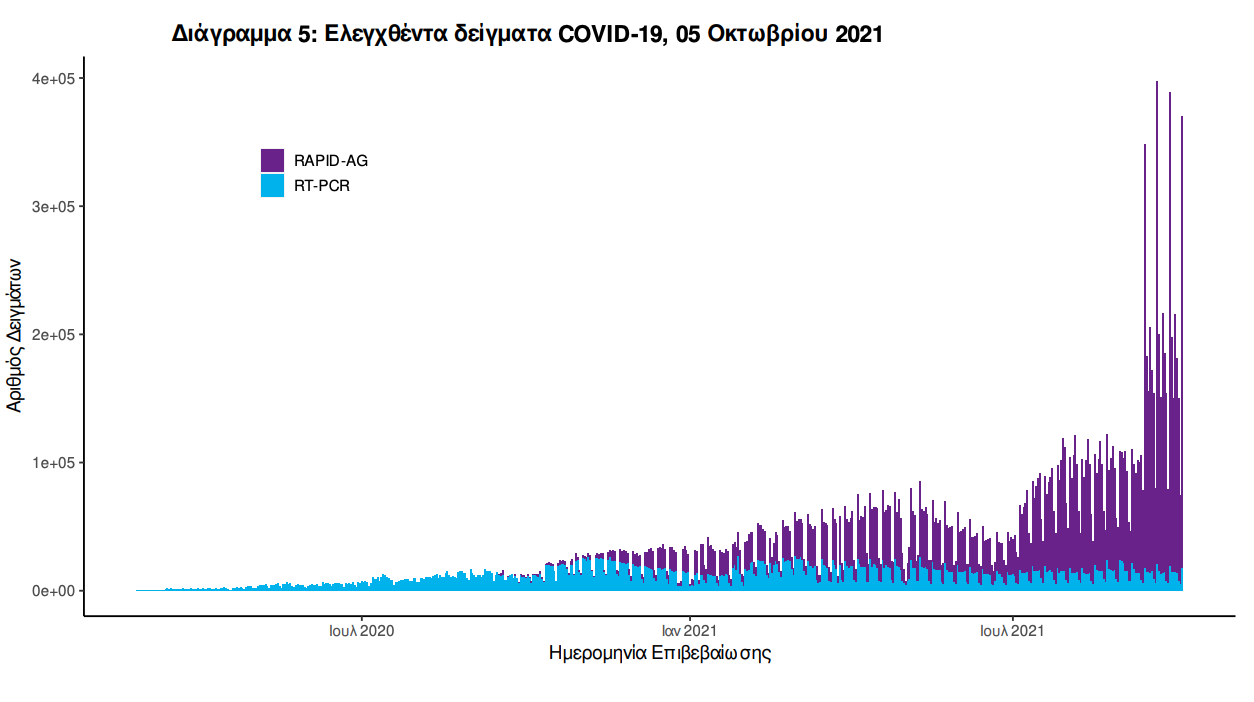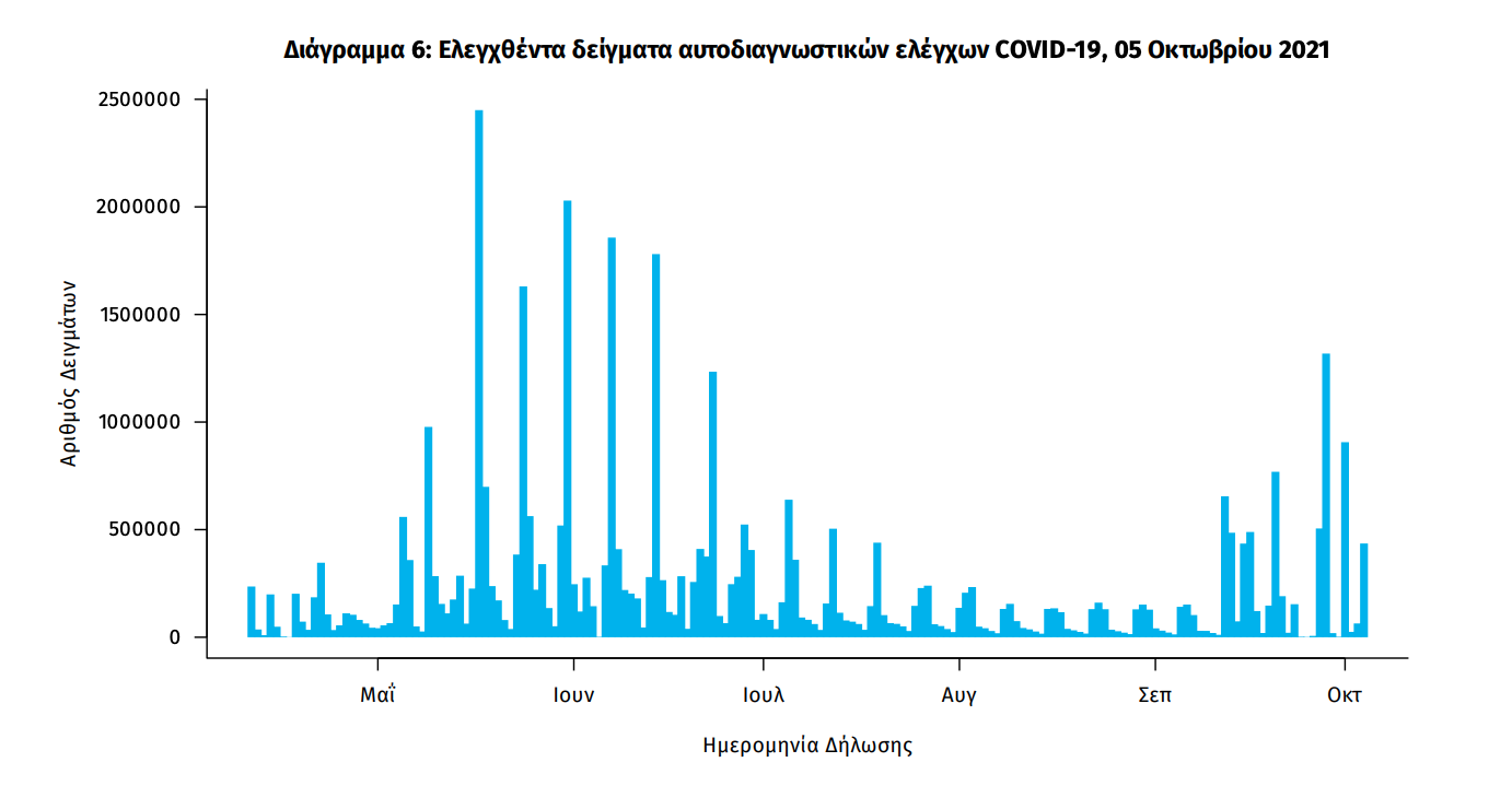 Δείγματα που έχουν ελεγχθεί: Από την 1η Ιανουαρίου 2020 μέχρι σήμερα, στα εργαστήρια που διενεργούν ελέγχους για τον νέο κορωνοϊό (SARS-CoV-2) και που δηλώνουν συστηματικά το σύνολο των δειγμάτων που ελέγχουν, έχουν συνολικά ελεγχθεί 6.690.514 κλινικά δείγματα ενώ από Μονάδες Υγείας και Κλιμάκια του ΕΟΔΥ που διενεργούν ελέγχους Rapid Ag έχουν ελεγχθεί 14.439.922 δείγματα. O μέσος όρος του επταημέρου είναι 191.454 δειγματοληπτικοί έλεγχοι. Αυτοδιαγνωστικοί έλεγχοι (Self-tests): Έως 04 Οκτωβρίου 2021, έχουν καταγραφεί ηλεκτρονικά 40.407.842 δηλώσεις αποτελέσματος αυτοδιαγνωστικού ελέγχου, ενώ 2.372.745 άτομα προσήλθαν για επανέλεγχο. Mαζικές Δειγματοληψίες ΕΟΔΥ: Στις 04 Οκτωβρίου 2021, πραγματοποιήθηκαν 171 δράσεις δειγματοληπτικών ελέγχων από τις Κινητές Ομάδες Υγείας (ΚΟΜΥ) του ΕΟΔΥ, στις οποίες διενεργήθηκαν 18.754 έλεγχοι Rapid Ag και ανευρέθηκαν 446 θετικά (2,38%).