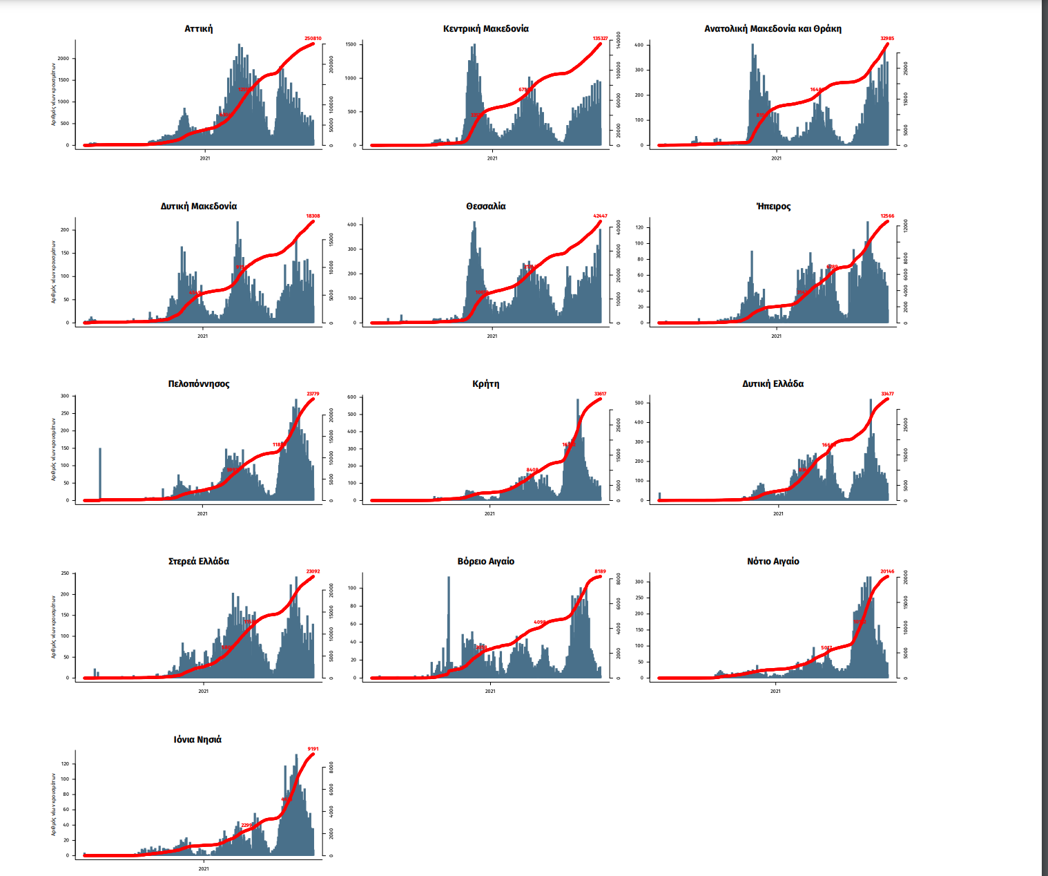 Παράρτημα 1: Επιδημικές καμπύλες κρουσμάτων COVID-19 με βάση την δηλωθείσα διεύθυνση μόνιμης κατοικίας του κρούσματος ή τη διεύθυνση προσωρινής διαμονής για τους τουρίστες και άλλους προσωρινά διαμένοντες στην Ελλάδα. Συμπεριλαμβάνονται τόσο κρούσματα με ιστορικό ταξιδίου όσο και κρούσματα με πιθανή εγχώρια μετάδοση.