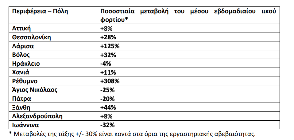 ΕΘΝΙΚΟ ΔΙΚΤΥΟ ΕΠΙΔΗΜΙΟΛΟΓΙΑΣ ΛΥΜΑΤΩΝ ΕΟΔΥ, 27 Σεπτεμβρίου – 3 Οκτωβρίου 2021 Ανακοινώνονται τα αποτελέσματα των εργαστηριακών ελέγχων του Εθνικού Δικτύου Επιδημιολογίας Λυμάτων για την επιδημιολογική επιτήρηση του ιού SARS-CoV-2 σε αστικά λύματα, το οποίο λειτουργεί υπό το συντονισμό του ΕΟΔΥ. Τα δείγματα προέρχονται από την Περιφέρεια Αττικής και τις πόλεις της Θεσσαλονίκης, της Λάρισας, του Βόλου, του Ηρακλείου, των Χανίων, του Ρεθύμνου, του Αγίου Νικολάου Λασιθίου,της Πάτρας, της Ξάνθης, της Αλεξανδρούπολης και των Ιωαννίνων. Τα δείγματα λαμβάνονται από τις εισόδους των κατά τόπους Μονάδων Επεξεργασίας Λυμάτων (ΜΕΛ) και αντιστοιχούν στον πληθυσμό που εξυπηρετείται από αυτές. Πίνακας 1: Ποσοστιαία μεταβολή στη μέση συγκέντρωση του ιικού φορτίου του SARS-CoV-2 στα αστικά λύματα ανά 100.000 κατοίκους την εβδομάδα 27 Σεπτεμβρίου – 3 Οκτωβρίου 2021 σε σχέση με την εβδομάδα 20-26 Σεπτεμβρίου 2021