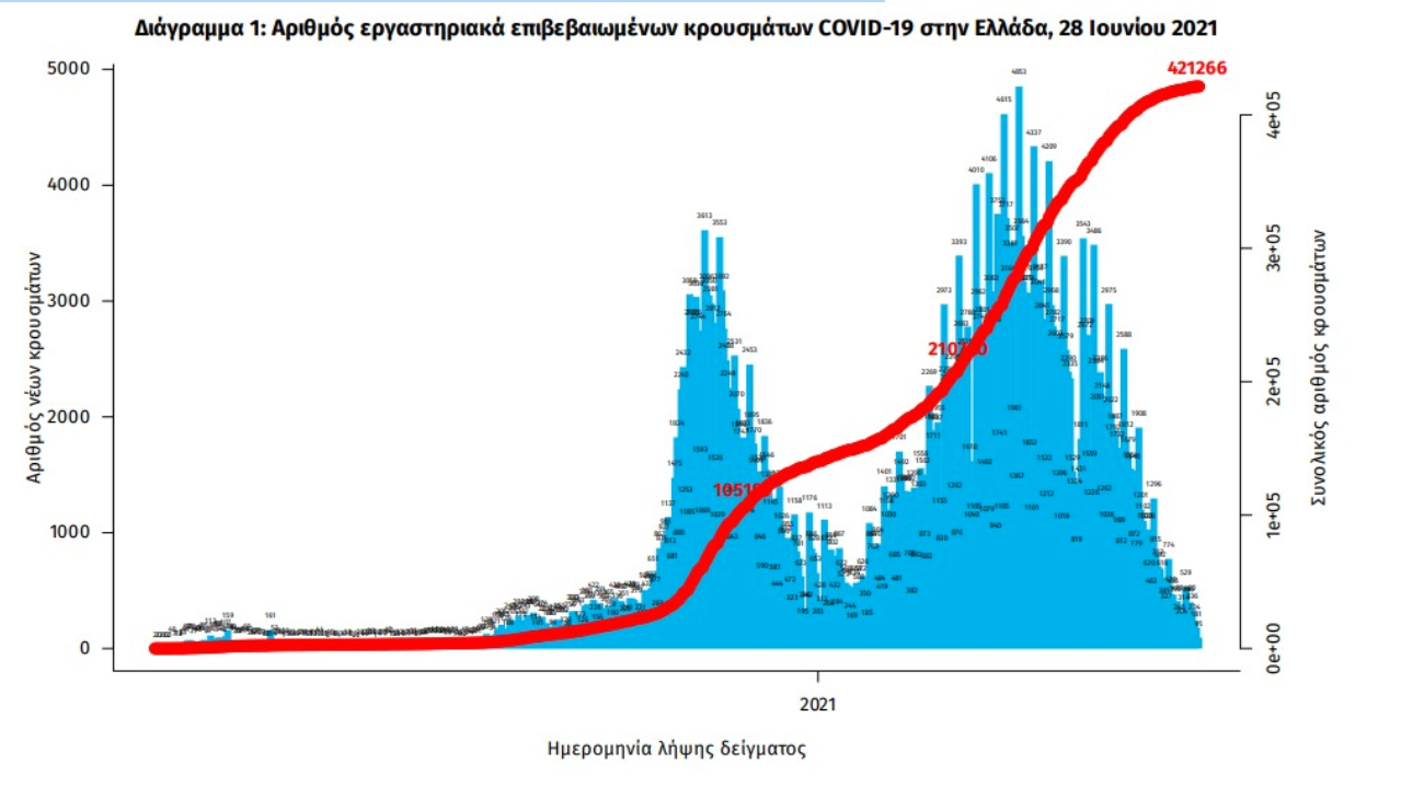 Τα νέα εργαστηριακά επιβεβαιωμένα κρούσματα της νόσου που καταγράφηκαν τις τελευταίες 24 ώρες είναι 362, εκ των οποίων 11 εντοπίστηκαν κατόπιν ελέγχων στις πύλες εισόδου της χώρας. Ο συνολικός αριθμός των κρουσμάτων ανέρχεται σε 421.266 (ημερήσια μεταβολή +0.1%), εκ των οποίων 51.2% άνδρες.