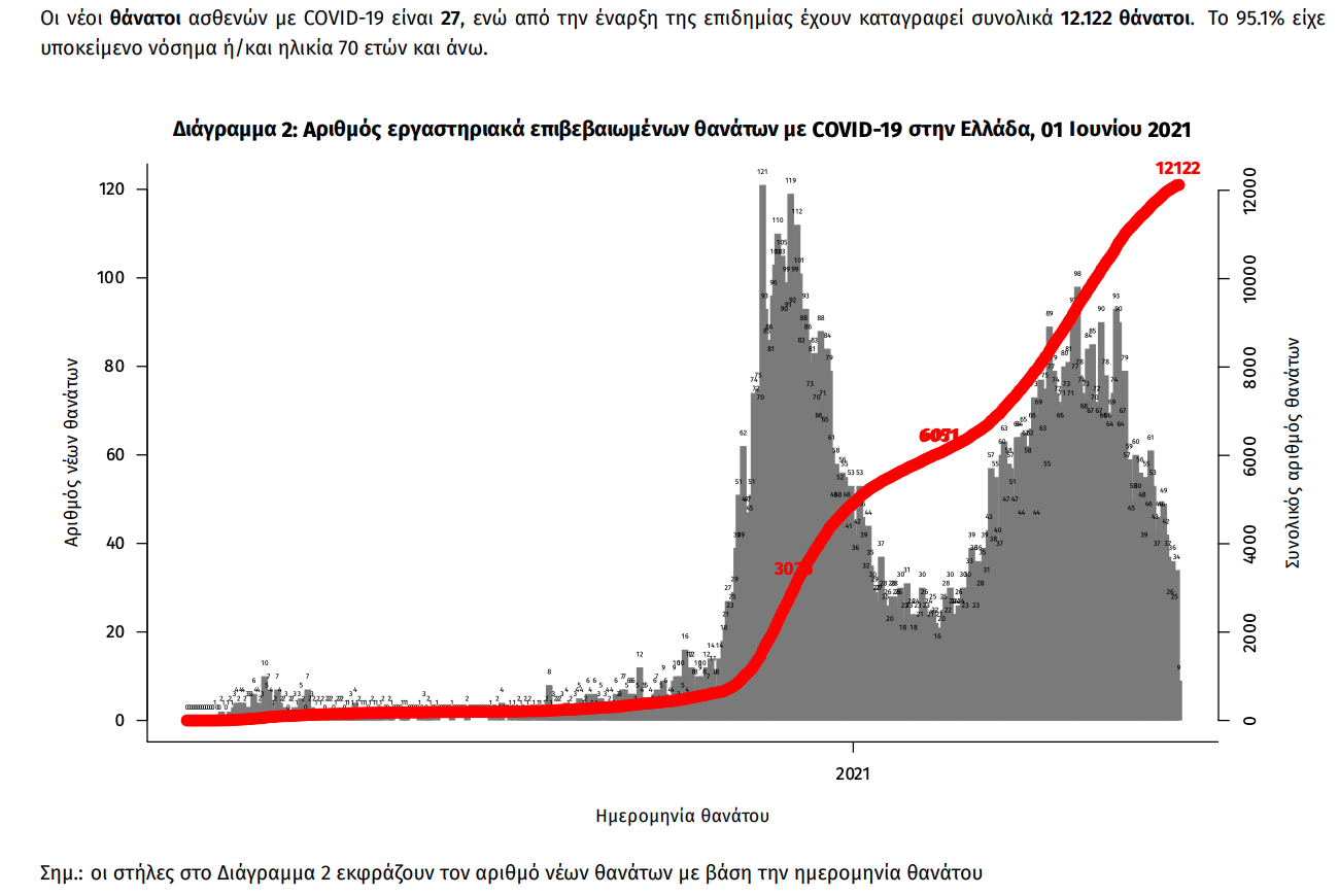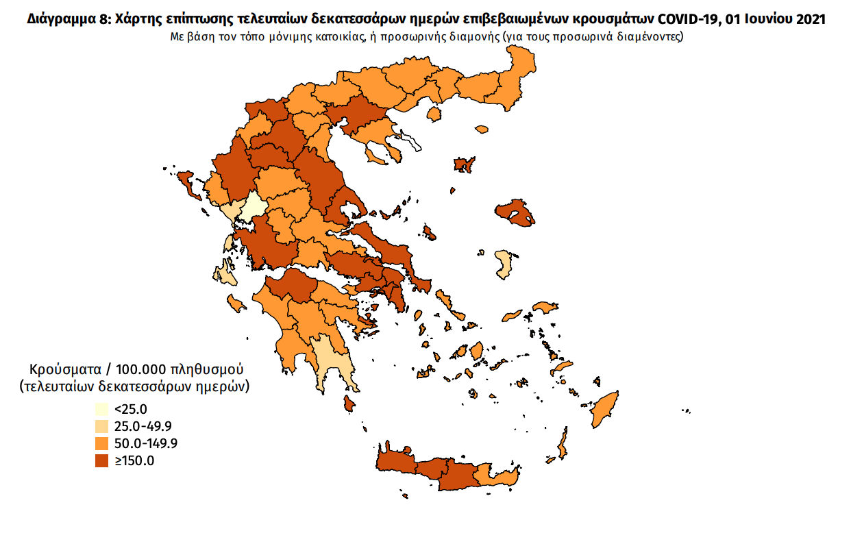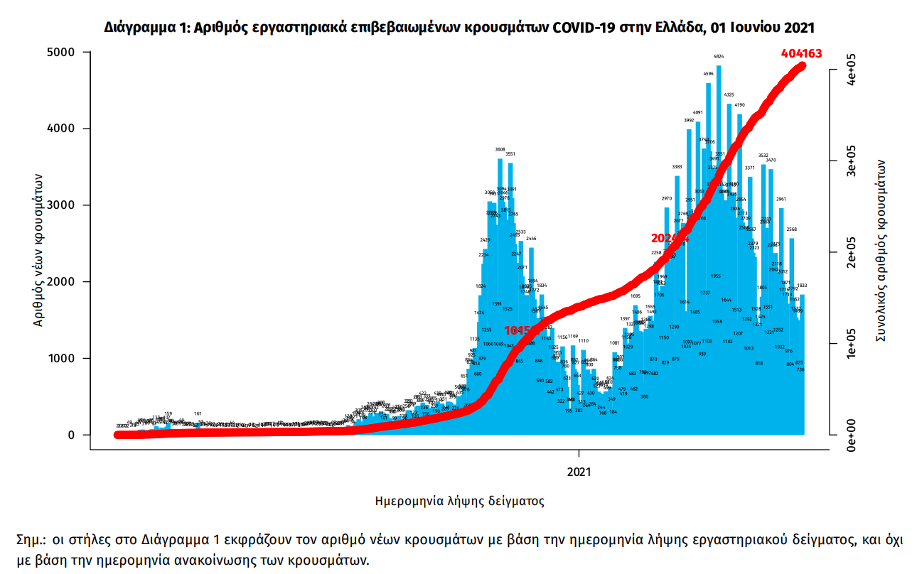 Τα στοιχεία που παρουσιάζονται αφορούν περιστατικά από την επιδημιολογική επιτήρηση της νόσου από το νέο κορωνοϊό (COVID19), με βάση τα δεδομένα που έχουν δηλωθεί στον ΕΟΔΥ και καταγραφεί μέχρι τις 01 Ιουνίου 2021 (ώρα 15:00). Τα νέα εργαστηριακά επιβεβαιωμένα κρούσματα της νόσου που καταγράφηκαν τις τελευταίες 24 ώρες είναι 1.886, εκ των οποίων 5 εντοπίστηκαν κατόπιν ελέγχων στις πύλες εισόδου της χώρας.
