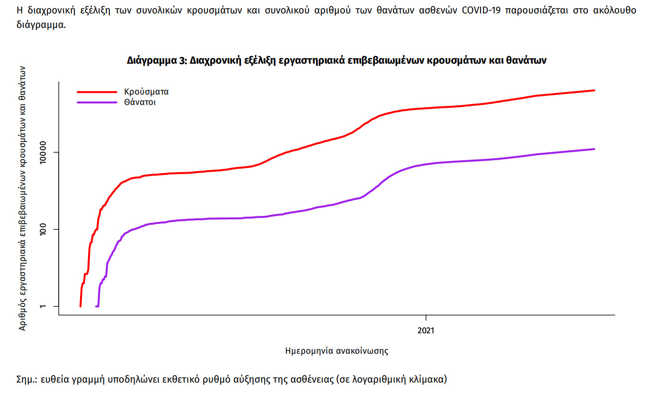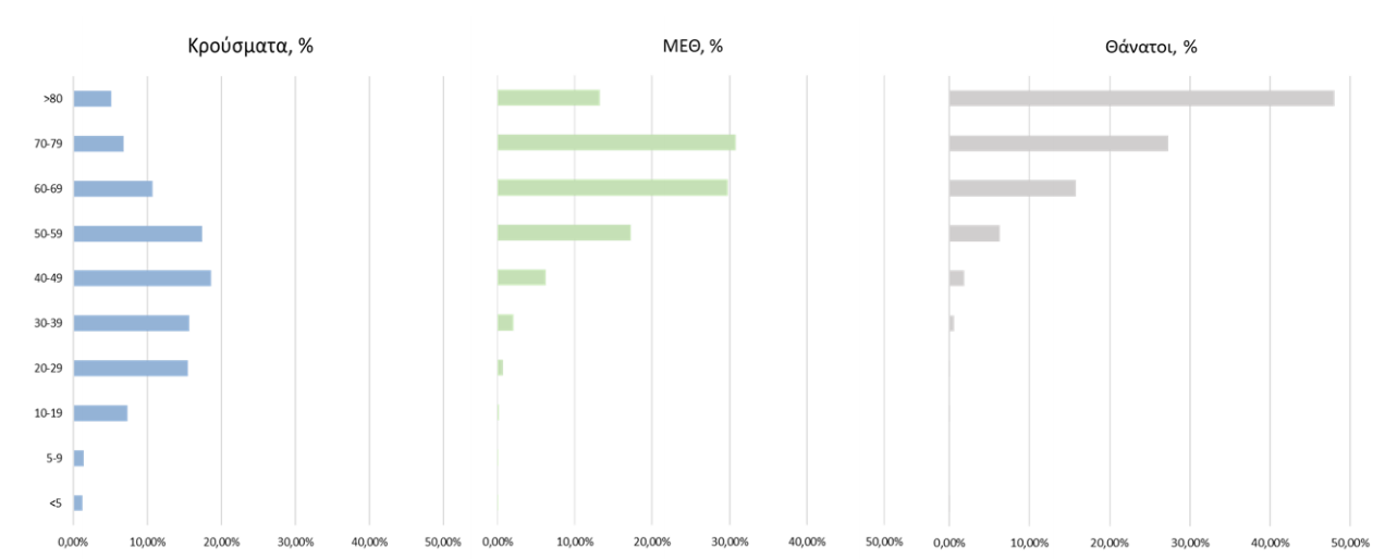 Ο αριθμός των ασθενών που νοσηλεύονται διασωληνωμένοι είναι 482 (60.2% άνδρες). Η διάμεση ηλικία τους είναι 67 έτη. To 86.9% έχει υποκείμενο νόσημα ή/και ηλικία 70 ετών και άνω. Από την αρχή της πανδημίας έχουν εξέλθει από τις ΜΕΘ 2.442 ασθενείς. Οι εισαγωγές2 νέων ασθενών Covid-19 στα νοσοκομεία της επικράτειας είναι 173 (ημερήσια μεταβολή +14.57%). Ο μέσος όρος εισαγωγών του επταημέρου είναι 202 ασθενείς.Η διάμεση ηλικία των κρουσμάτων είναι 43 έτη (εύρος 0.2 έως 106 έτη), ενώ η διάμεση ηλικία των θανόντων είναι 78 έτη (εύρος 0.2 έως 106 έτη). Διάγραμμα 4: Ηλικιακή Κατανομή κρουσμάτων, νοσηλευόμενων στις MEΘ και ασθενών που απεβίωσαν από την αρχή της πανδημίας