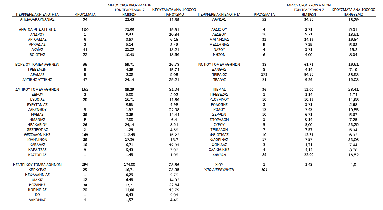 Κατανομή ανακοινωθέντων εγχώριων κρουσμάτων: Από το σύνολο των 1.886 νέων κρουσμάτων του νέου ιού στη χώρα 7 είναι εισαγόμενα εκ των οποίων 5 εντοπίστηκαν κατόπιν ελέγχων στις πύλες εισόδου της χώρας. Η κατανομή των 1.879 νέων εγχώριων κρουσμάτων ανά Περιφερειακή Ενότητα παρουσιάζεται στον κατωτέρω πίνακα.3 Πίνακας 2: Ημερήσιος αριθμός και κρούσματα ανά 100.000 πληθυσμού επιβεβαιωμένων εγχώριων κρουσμάτων COVID-19 ανά περιφερειακή ενότητα στις 01 Ιουνίου 2021