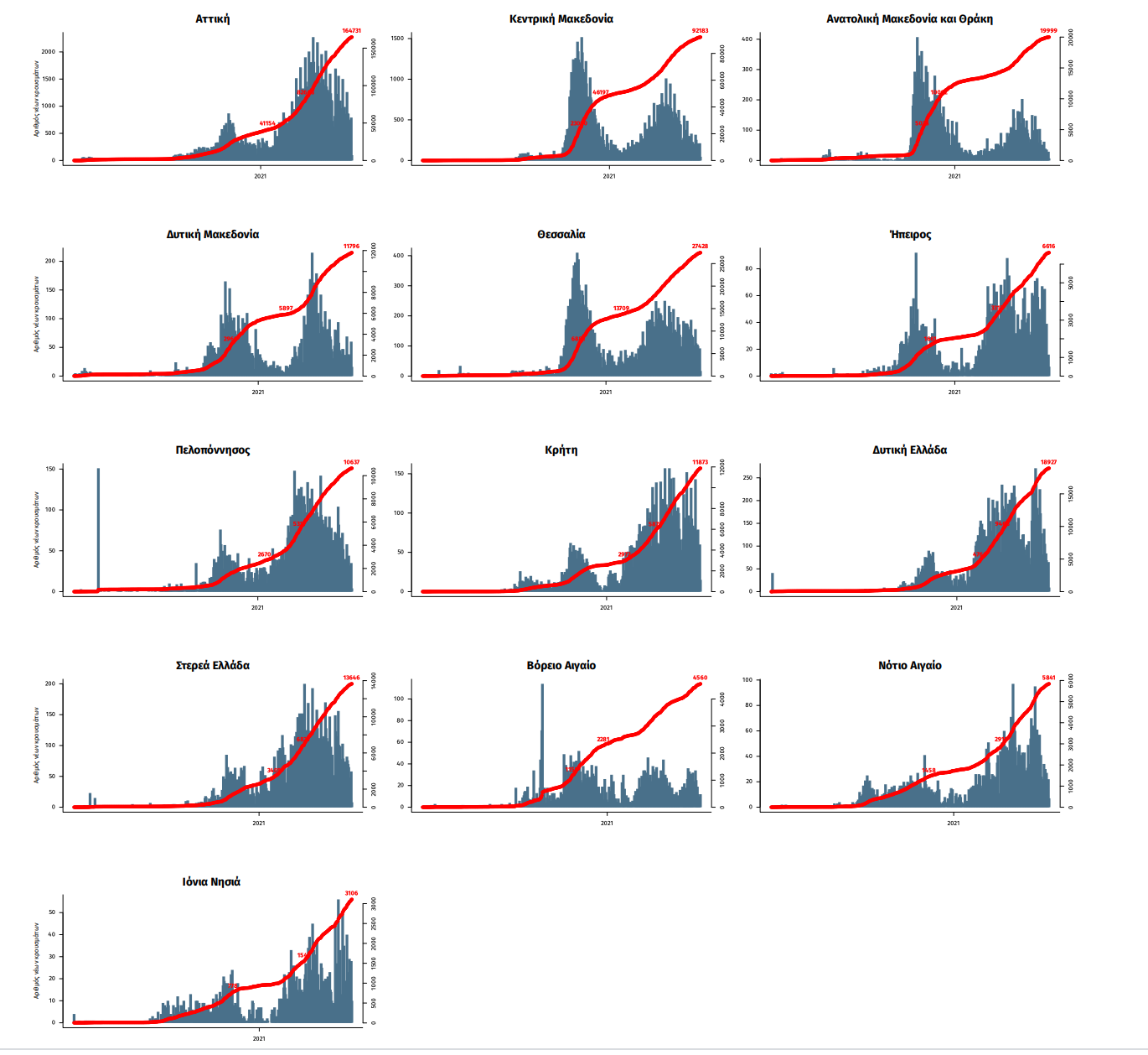 Παράρτημα 1: Επιδημικές καμπύλες κρουσμάτων COVID-19 με βάση την δηλωθείσα διεύθυνση μόνιμης κατοικίας του κρούσματος ή τη διεύθυνση προσωρινής διαμονής για τους τουρίστες και άλλους προσωρινά διαμένοντες στην Ελλάδα. Συμπεριλαμβάνονται τόσο κρούσματα με ιστορικό ταξιδίου όσο και κρούσματα με πιθανή εγχώρια μετάδοση.
