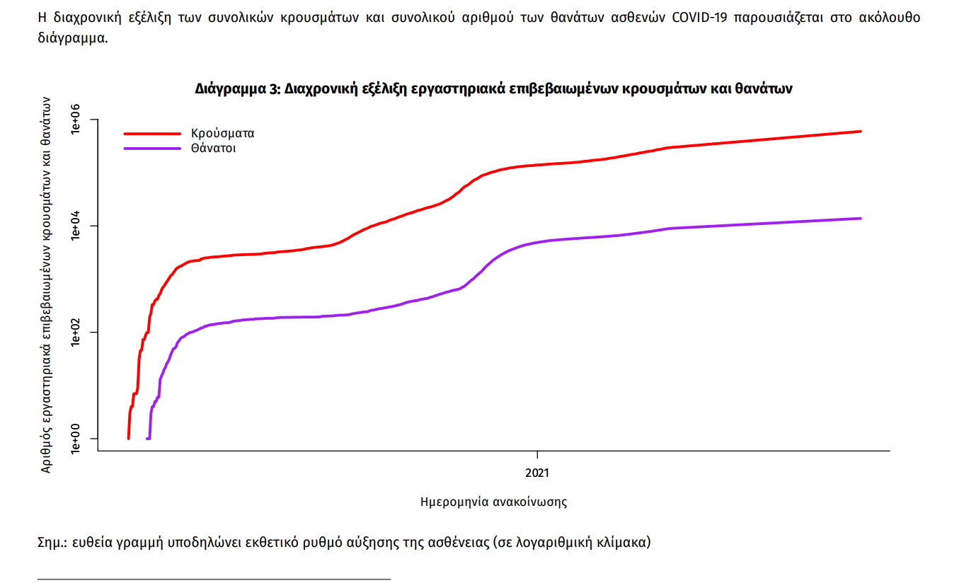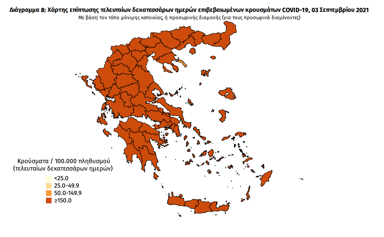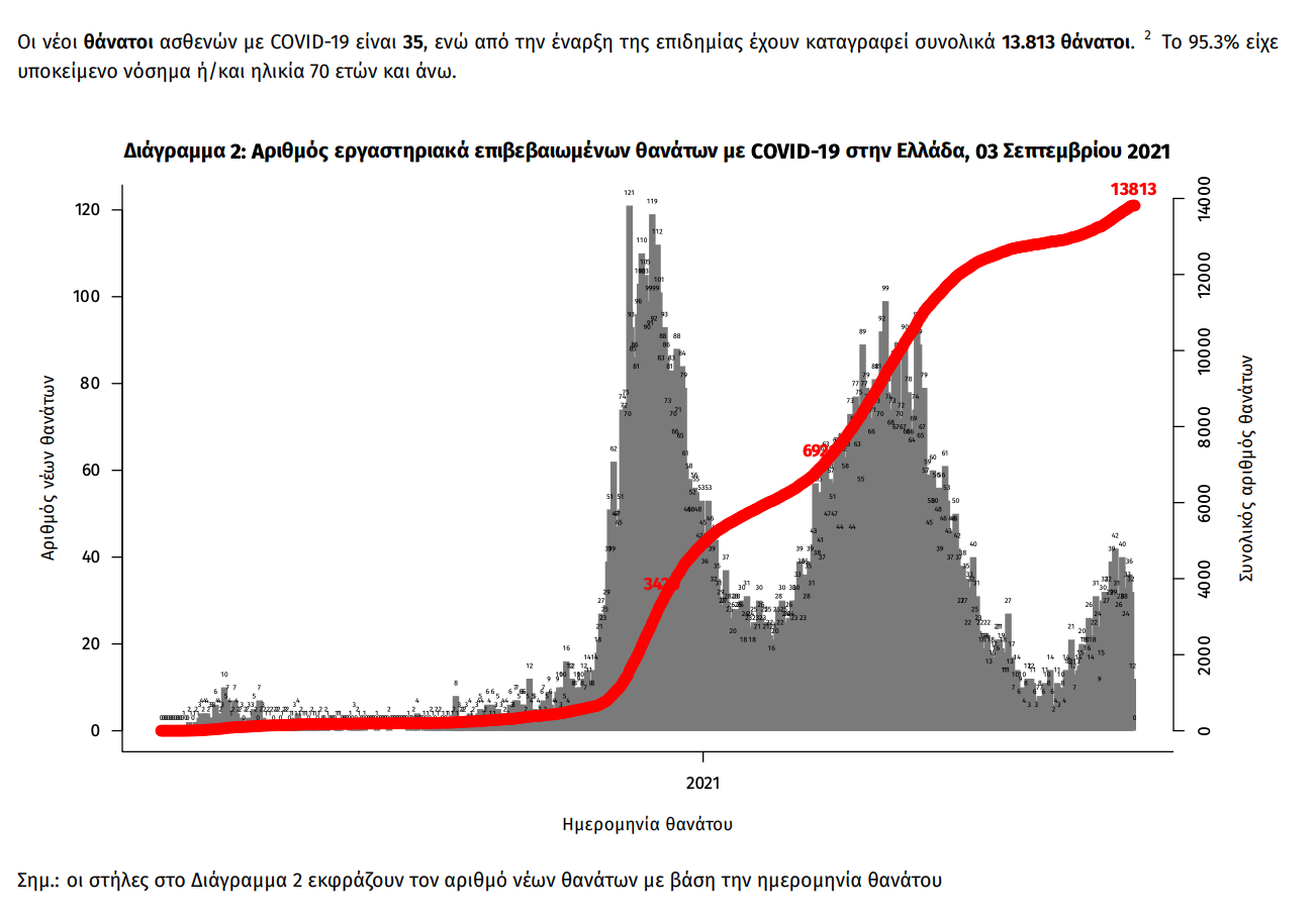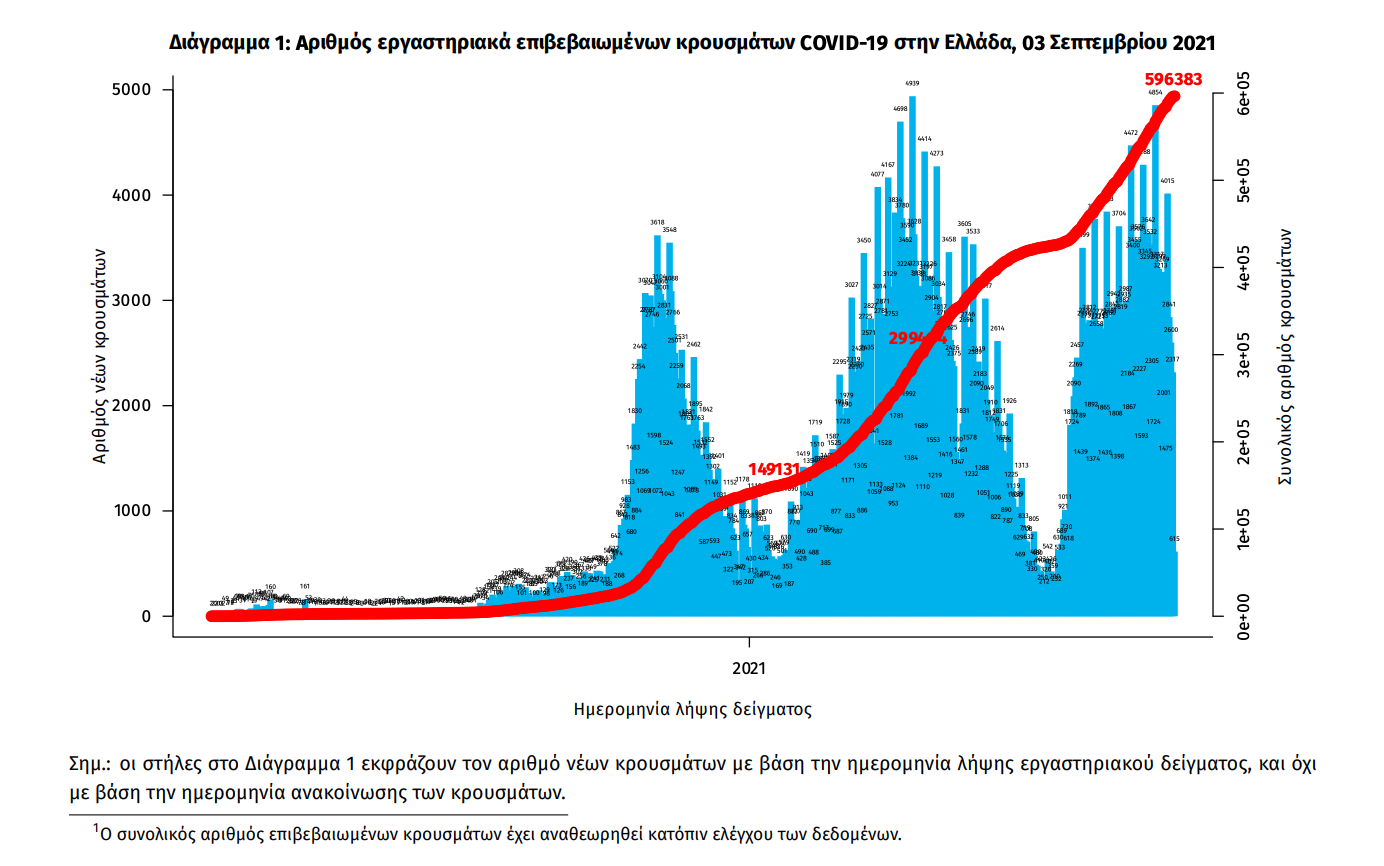 Τα στοιχεία που παρουσιάζονται αφορούν περιστατικά από την επιδημιολογική επιτήρηση της νόσου από το νέο κορωνοϊό (COVID19), με βάση τα δεδομένα που έχουν δηλωθεί στον ΕΟΔΥ και καταγραφεί μέχρι τις 03 Σεπτεμβρίου 2021 (ώρα 15:00). Τα νέα εργαστηριακά επιβεβαιωμένα κρούσματα της νόσου που καταγράφηκαν τις τελευταίες 24 ώρες είναι 2.729 , εκ των οποίων 13 εντοπίστηκαν κατόπιν ελέγχων στις πύλες εισόδου της χώρας. Ο συνολικός αριθμός των κρουσμάτων ανέρχεται σε 596.383 (ημερήσια μεταβολή +0.5%), εκ των οποίων 51.1% άνδρες. 1 Με βάση τα επιβεβαιωμένα κρούσματα των τελευταίων 7 ημερών, 164 θεωρούνται σχετιζόμενα με ταξίδι από το εξωτερικό και 1.478 είναι σχετιζόμενα με ήδη γνωστό κρούσμα. Ημερήσια εξέλιξη της πανδημίας: Η ημερήσια κατανομή των επιβεβαιωμένων κρουσμάτων είναι η ακόλουθη (η γραμμή παριστάνει την συνολική, αθροιστική κατανομή των κρουσμάτων).